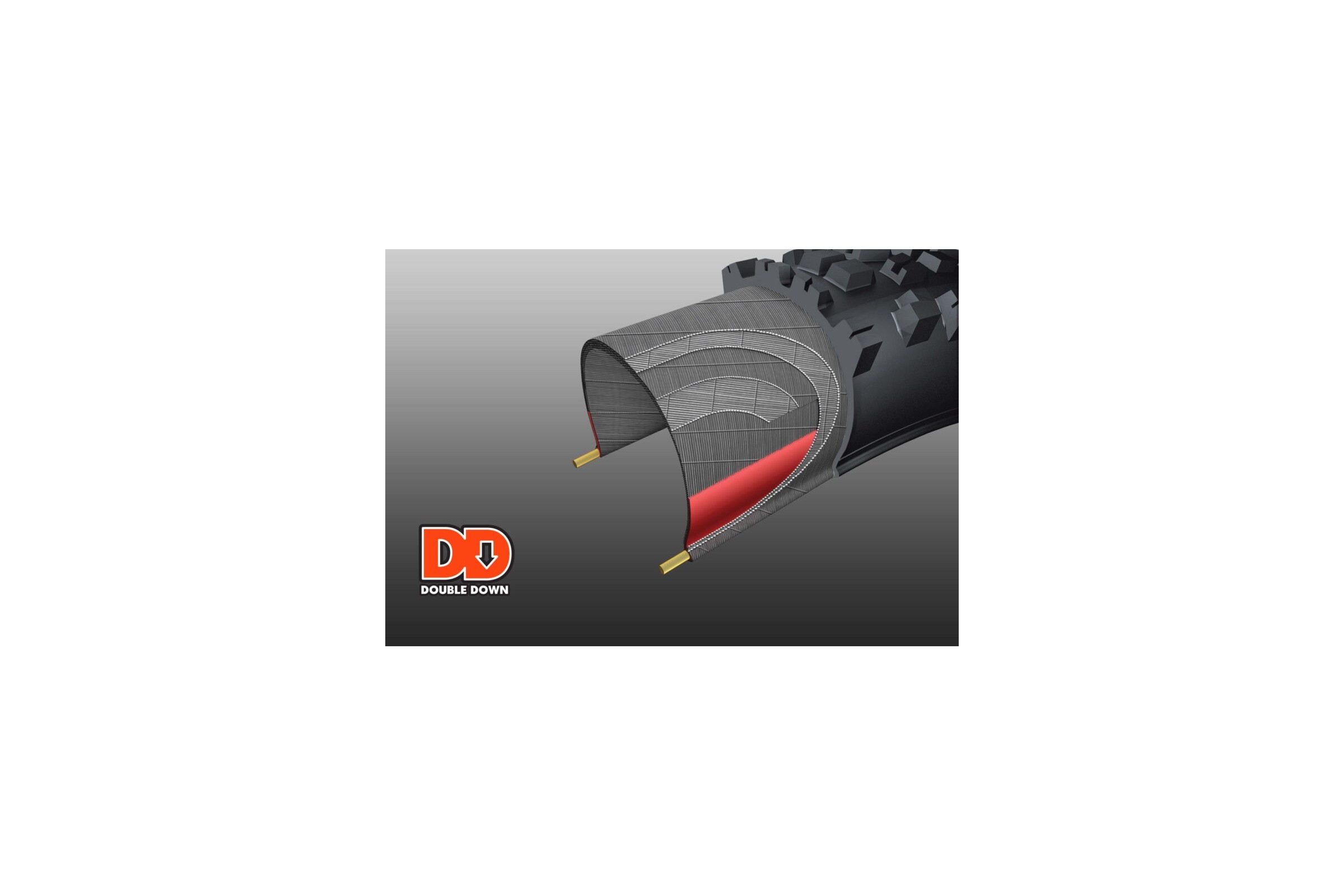 DoubleDown (DD) to zaawansowana konstrukcja opony opracowana z myślą o wyścigach enduro i downhill. Łączy dwie warstwy oplotu 120 TPI z wewnętrzną wkładką butylową, co zapewnia doskonałe połączenie wytrzymałości i wsparcia przy niższej wadze niż opony zjazdowe DH.