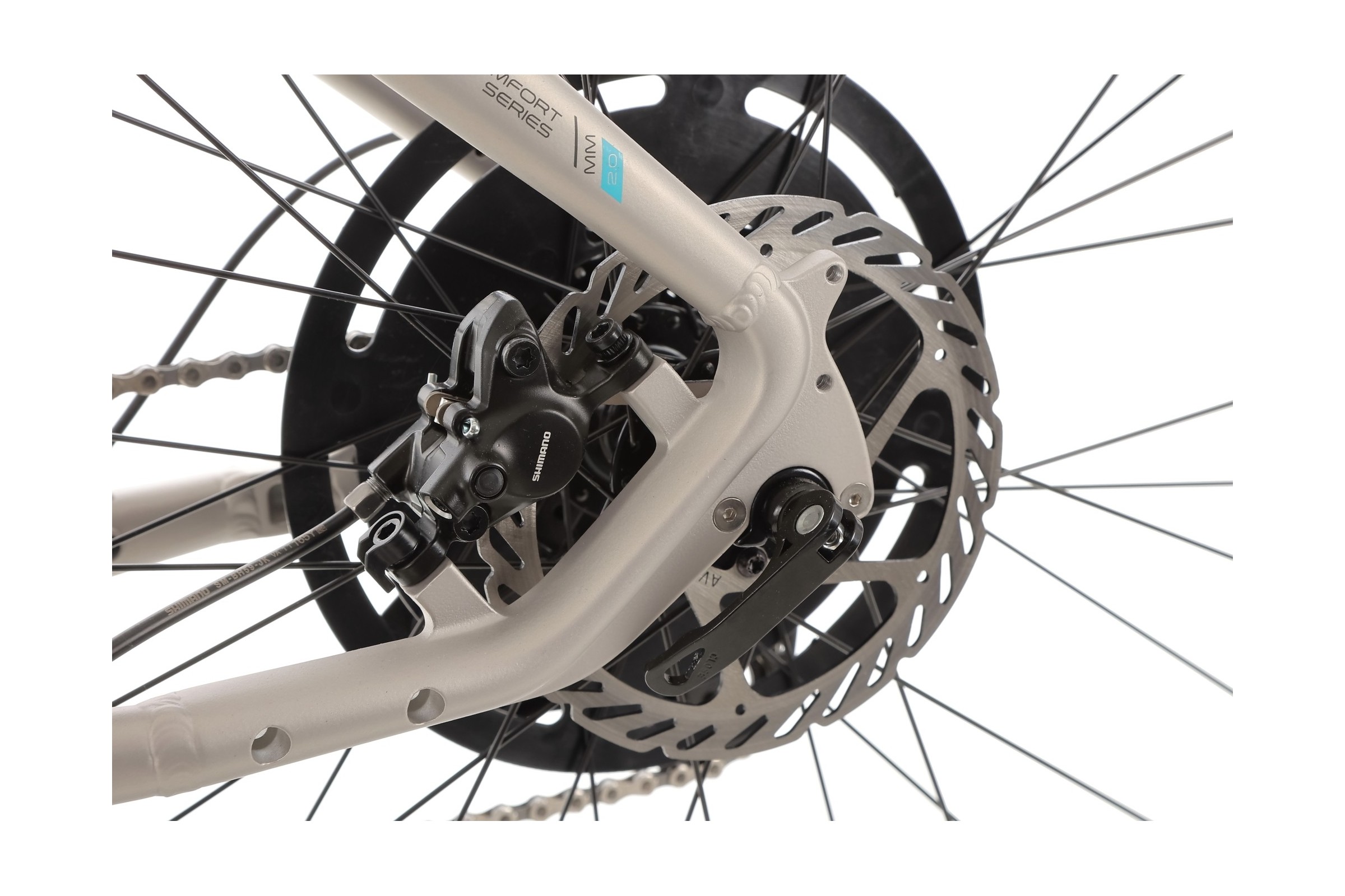 Za skuteczne hamowanie odpowiadają hydrauliczne hamulce tarczowe Shimano BL-MT200. Przednia tarcza o średnicy 180 mm i tylna 160 mm zapewniają dużą siłę hamowania oraz precyzję działania niezależnie od warunków pogodowych.