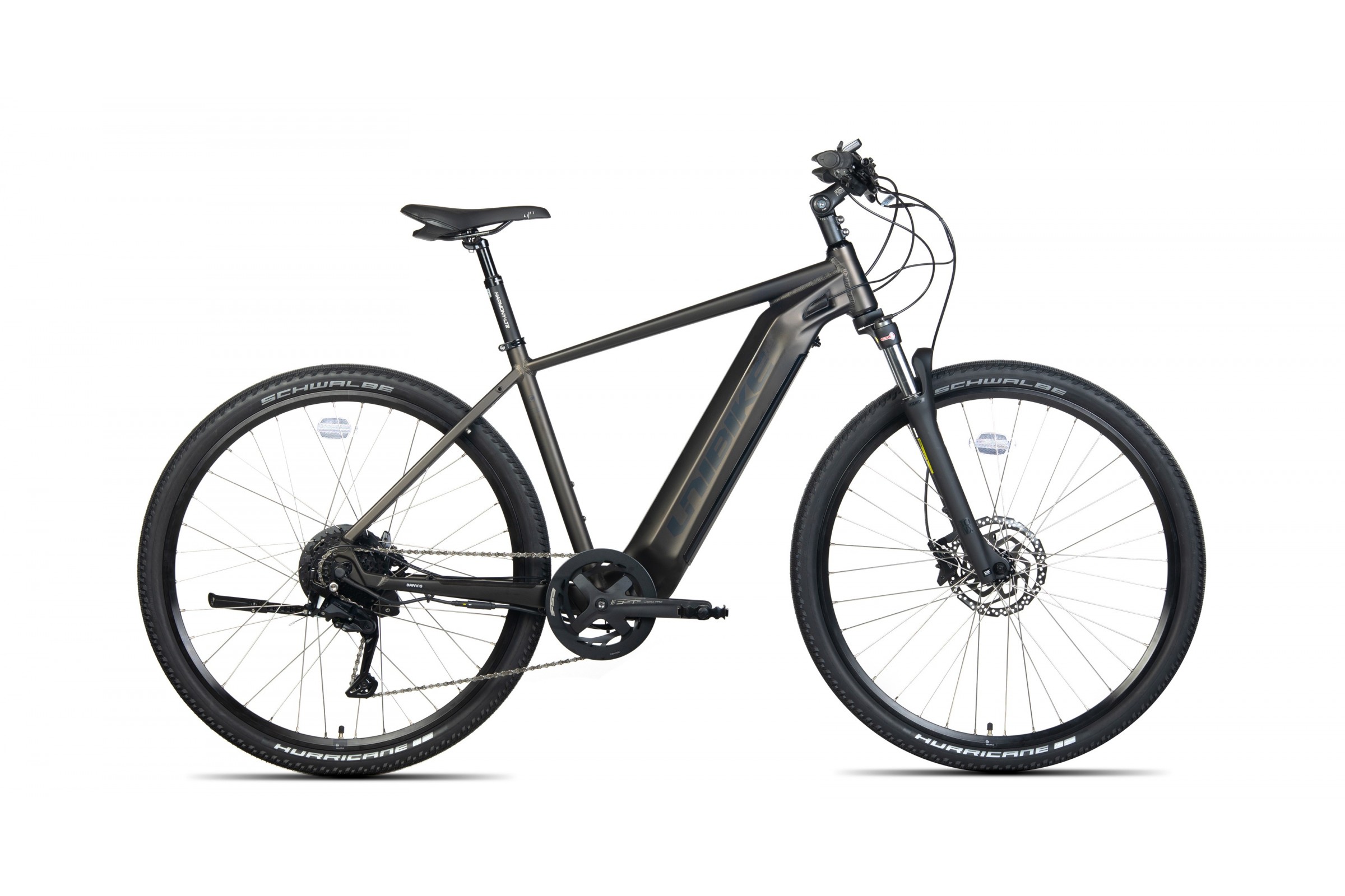 Koła zbudowane na czarnych obręczach Stars Disc z zakuwkami oraz piastami KT Quando/Bafang są wytrzymałe i gotowe na różnorodne nawierzchnie. Opony Schwalbe Hurricane 28x2.00 z paskiem odblaskowym oferują niski opór toczenia na asfalcie i dobrą przyczepność na luźnym podłożu.