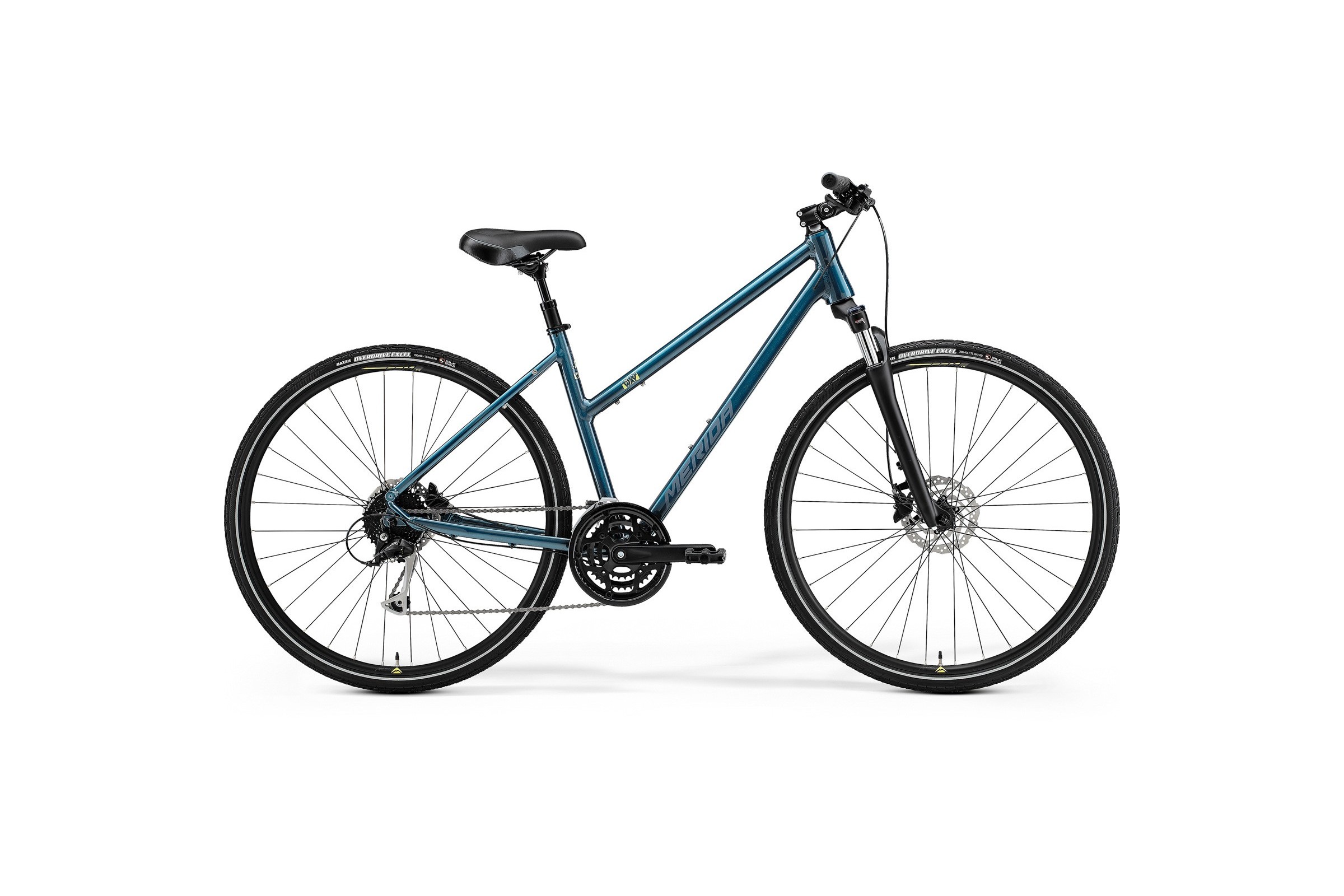 Rower toczy się na dużych kołach 28 cali z wytrzymałymi obręczami Merida Comp TK. Na nich osadzono wysokiej klasy opony Maxxis Overdrive Excel o szerokości 40C. Posiadają one niskie opory toczenia, co pozwala lżej pedałować, oraz wkładkę Silkshield zwiększającą odporność na przebicia. Dodatkowy pasek odblaskowy na oponach znacząco poprawia Twoją widoczność i bezpieczeństwo po zmroku.