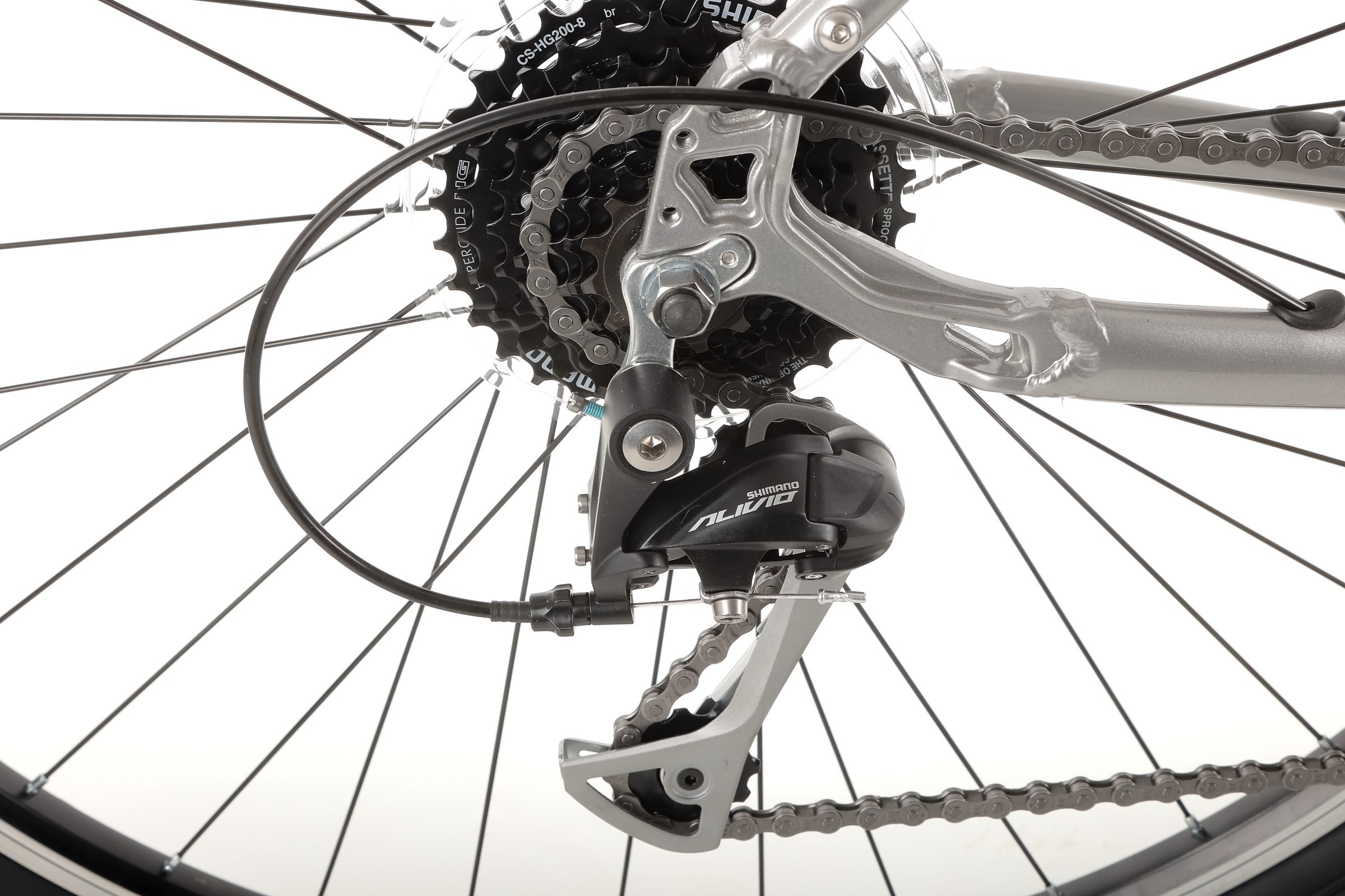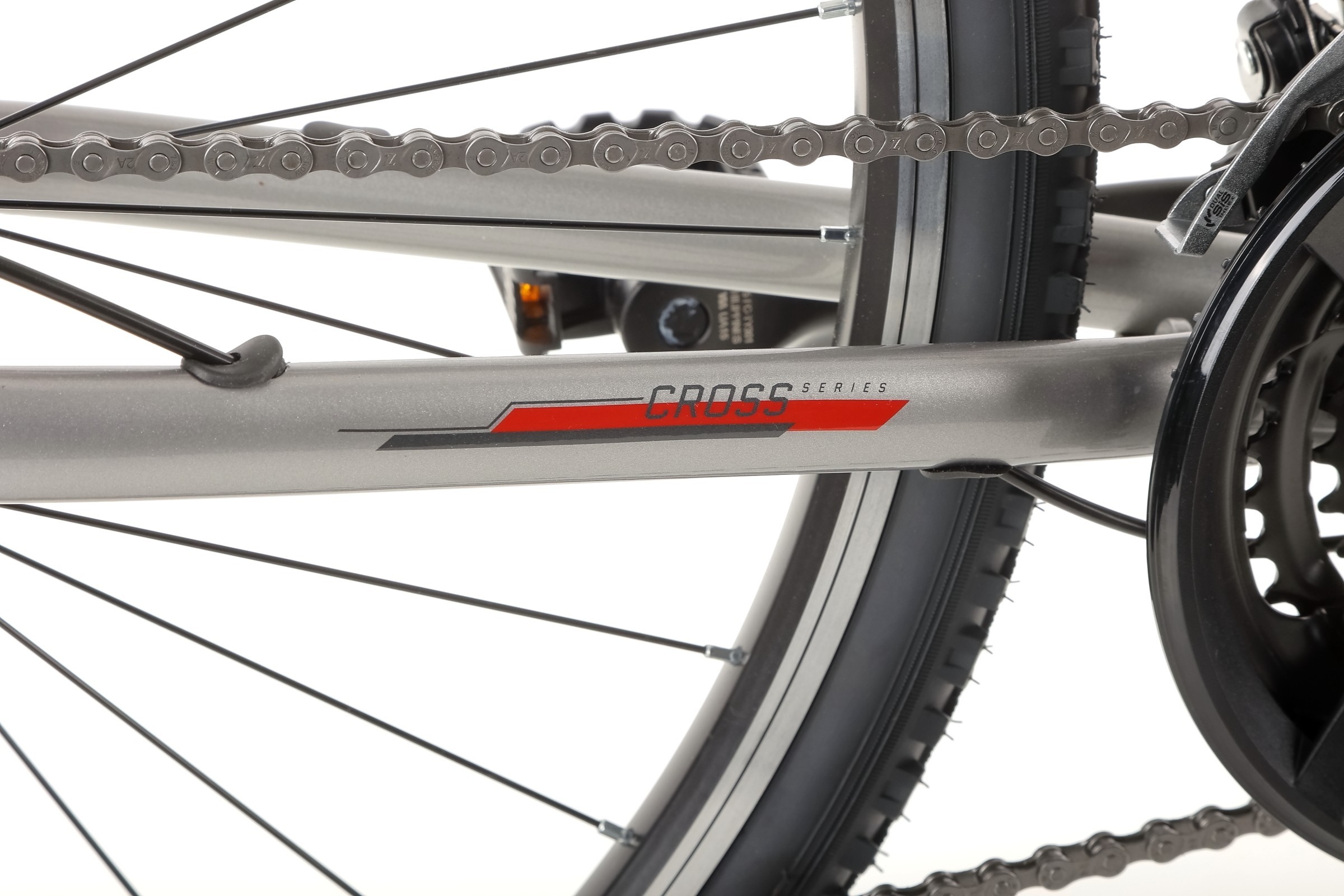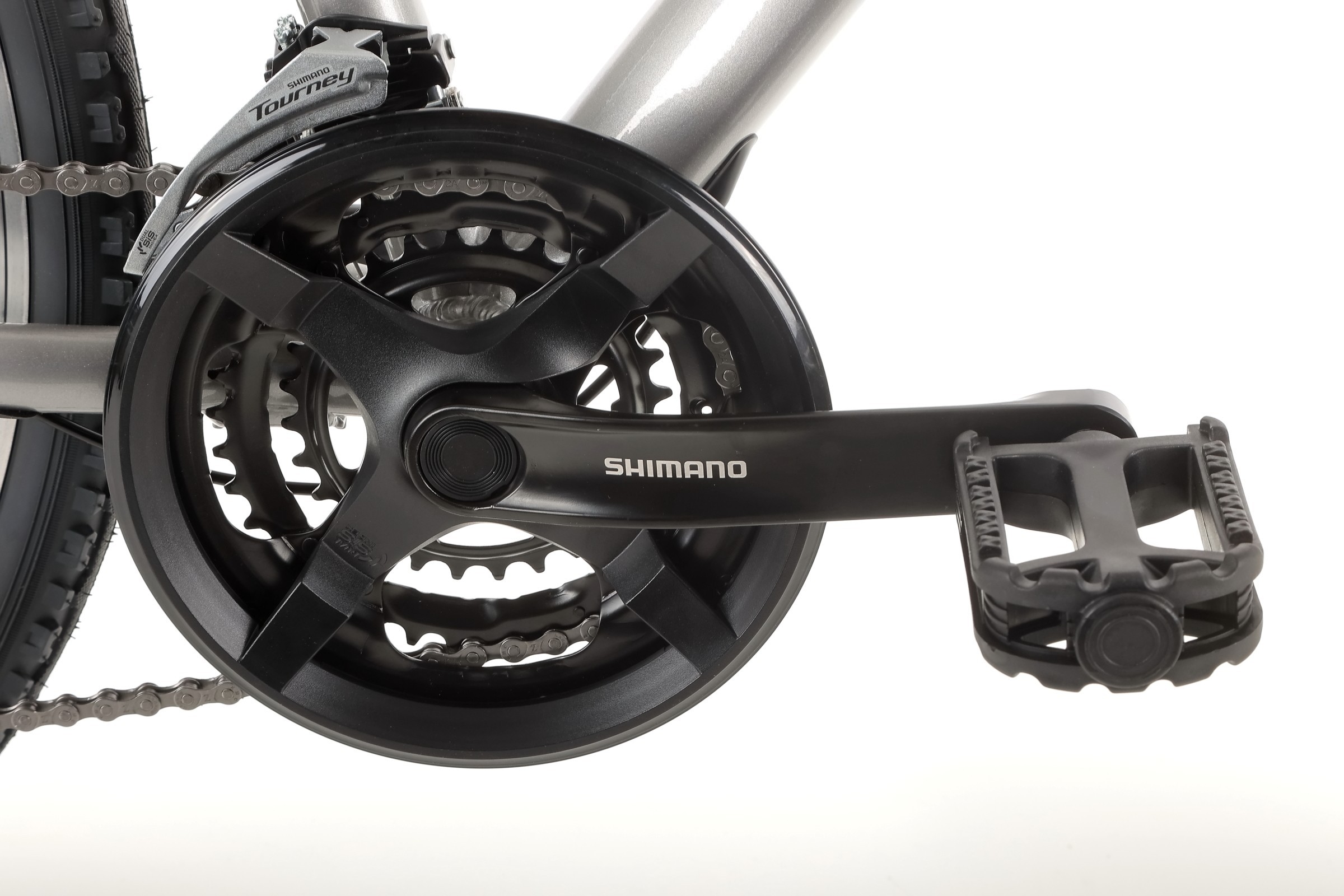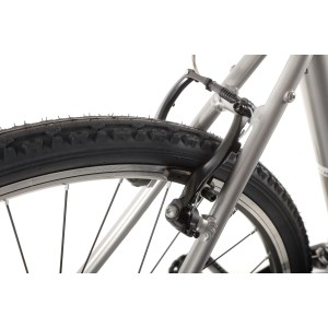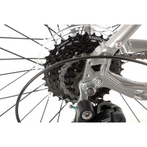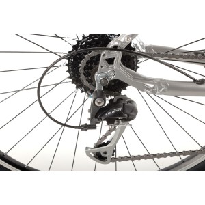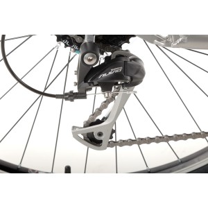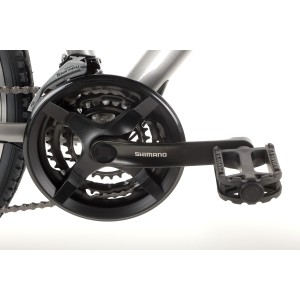 Napęd roweru oparty jest na niezawodnych komponentach Shimano, które zapewniają płynne i precyzyjne zmiany biegów. Dzięki 3-biegowemu mechanizmowi korbowemu oraz 8-rzędowej kasecie, rower idealnie sprawdza się zarówno na płaskich drogach, jak i w lekkim terenie, oferując szeroki zakres przełożeń do pokonywania różnych wzniesień.