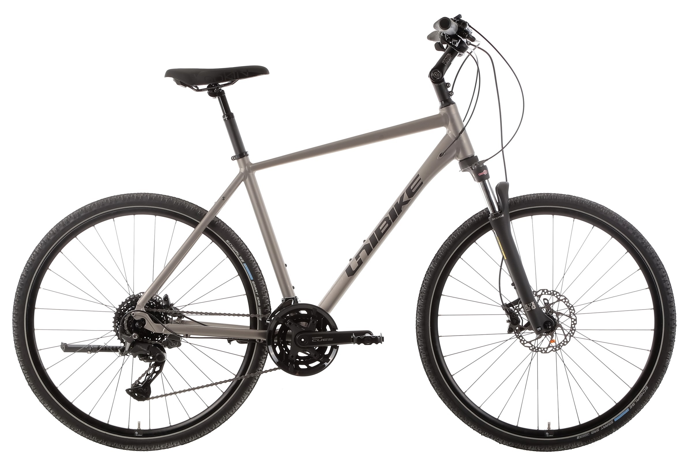 Rower posiada wytrzymałe koła JHT z czarnymi obręczami i zakuwkami oraz piasty SHIMANO QC400. Opony SCHWALBE SMART SAM z mieszanką ADDIX (28x1.65") zapewniają doskonałą przyczepność na różnych nawierzchniach, zarówno w mieście, jak i w terenie.