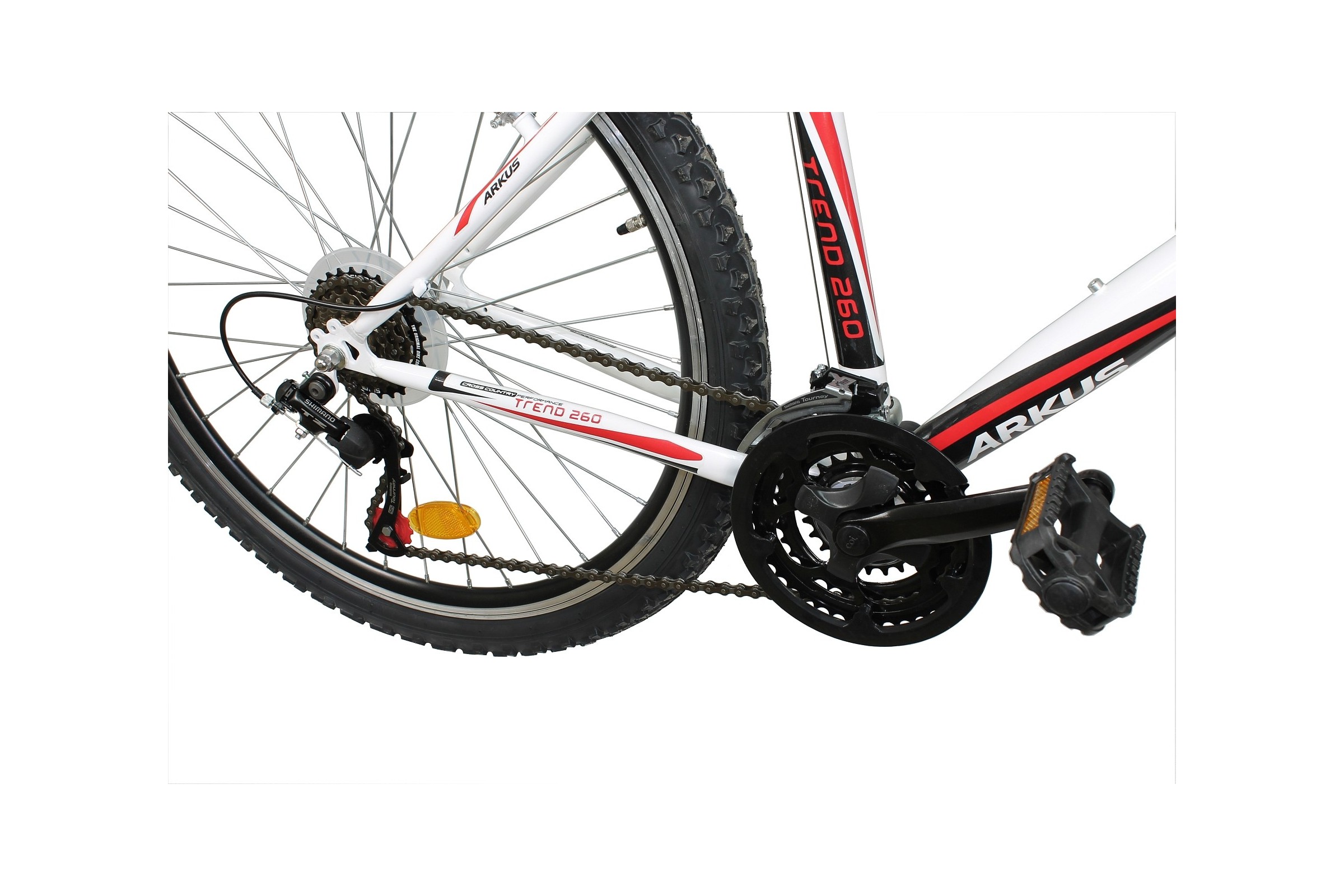 Rower Arkus Trend 260 wyposażony jest w wytrzymałą stalową ramę wykonaną ze stali o podwyższonej wytrzymałości Hi-Ten. Rower został wyposażony w mocne i proste w obsłudze hamulce v-brake, posiada 21 biegów, sprawdzone i markowe przerzutki Shimano TX-51 - zapewnią płynną zmianę przełożeń. Wygodne siodło Selle Royal Mach, amortyzowany widelec Zoom 221 SusFork oraz opony w rozmiarze 26x1,9 zapewnią komfort i przyjemność z jazdy.