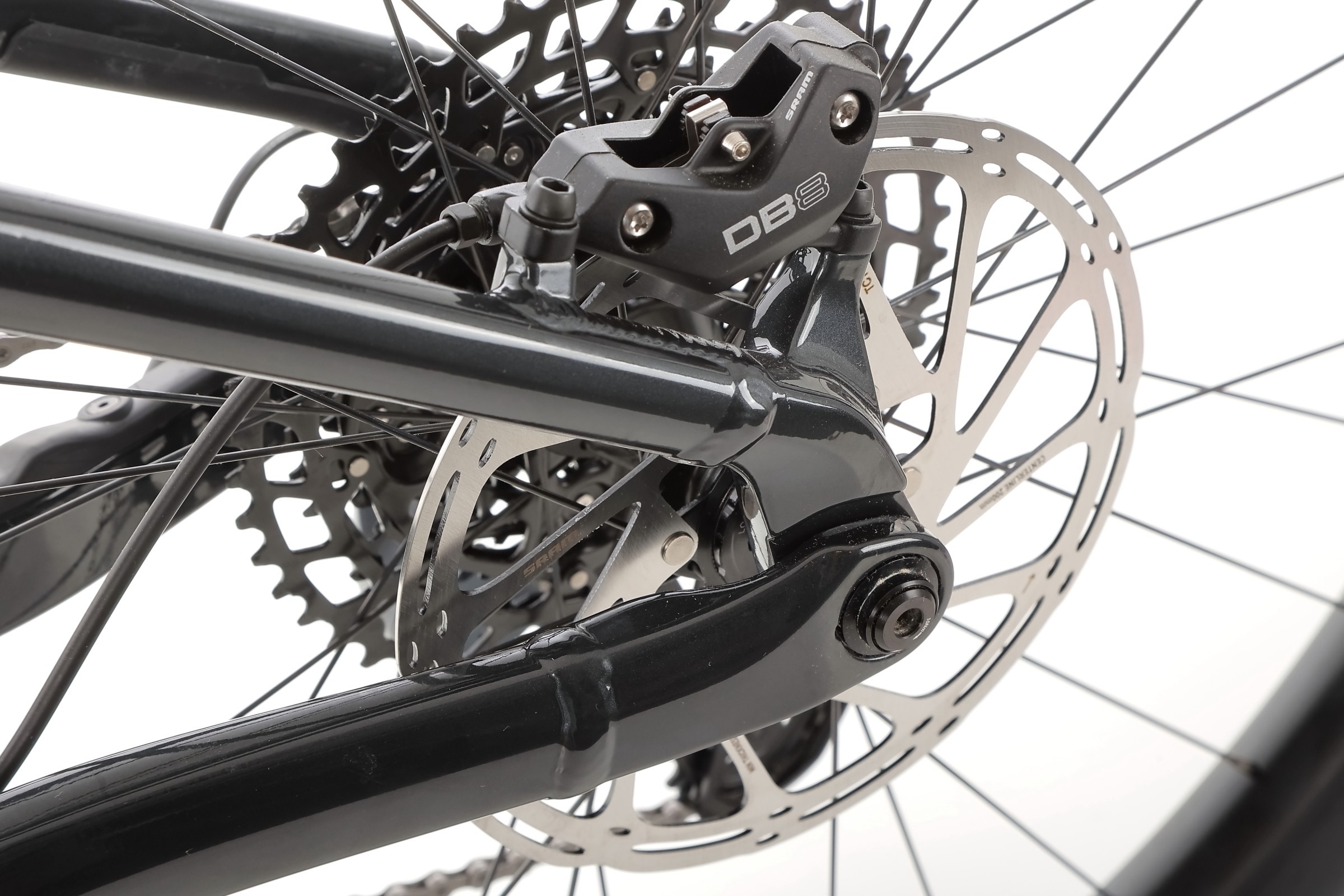 Hydrauliczne hamulce tarczowe Sram DB8 Black dostarczają natychmiastowej siły hamowania i świetnej modulacji. Niezależnie czy hamujesz na mokrej skale, czy na luźnym szutrze – możesz liczyć na pełne panowanie nad rowerem.