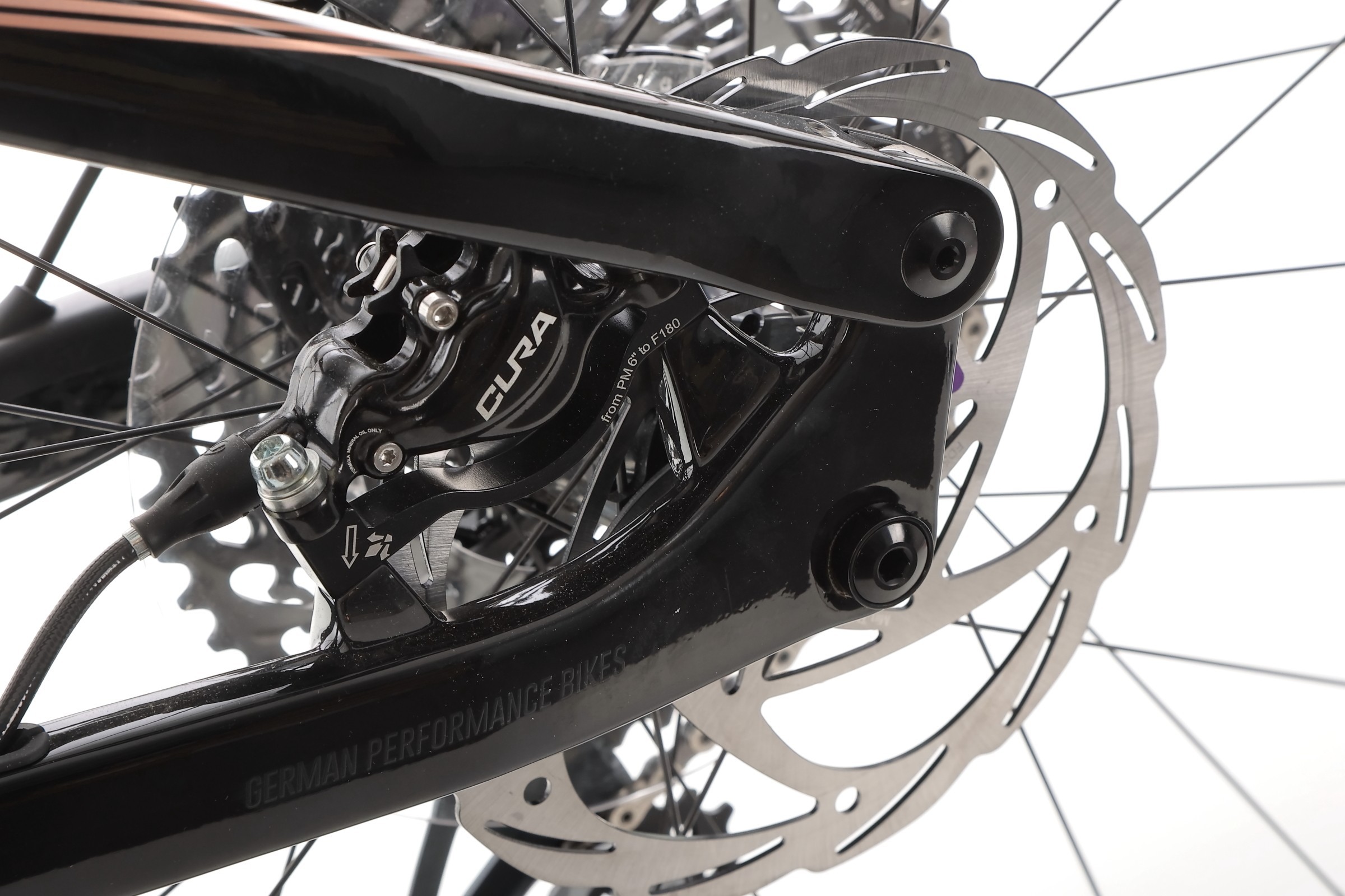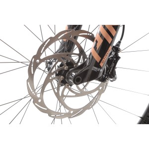 Hamulce hydrauliczne Formula Cura zapewniają doskonałą kontrolę i pewność hamowania w każdych warunkach. Na przednim kole zastosowano mocny, 4-tłoczkowy zacisk Formula Cura 4 z dużą tarczą 203 mm, co gwarantuje maksymalną siłę hamowania, niezbędną na stromych zjazdach. Z tyłu pracuje 2-tłoczkowy zacisk Formula Cura z tarczą 180 mm, zapewniający idealne wyważenie między skutecznością a lekkością konstrukcji. Dzięki temu rower oferuje pewne i stabilne hamowanie, niezależnie od trudności terenu czy warunków pogodowych.