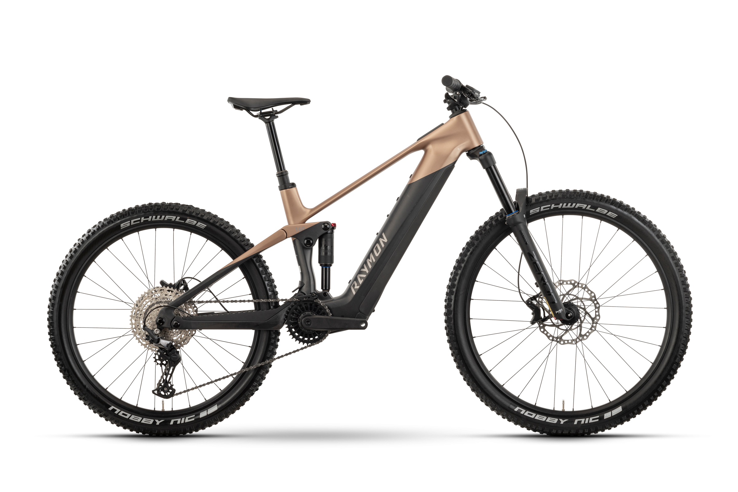 Rama R-Raymon Tarok Pure to serce tego roweru – wykonana z kompozytu węglowego HSC, zapewnia niezwykłą lekkość (ok. 2,7 kg sama rama, cały rower ok. 24 kg) oraz wytrzymałość nawet w najtrudniejszym terenie. Geometria typu mullet (koło 29” z przodu, 27,5” z tyłu) gwarantuje stabilność na zjazdach i zwrotność na technicznych odcinkach. Rama posiada wymienny akumulator oraz skok 160 mm, co czyni ją idealną do jazdy po szlakach i górskich trasach.