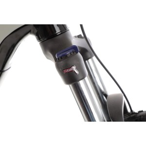 Przedni amortyzator Suntour XCM32-Boost-LO-DS o skoku 120 mm z regulacją blokady zapewnia komfort i kontrolę zarówno na szutrach, jak i w lekkim terenie.