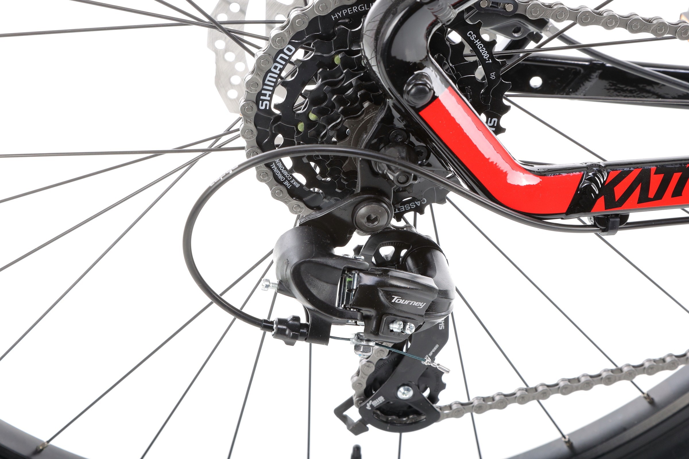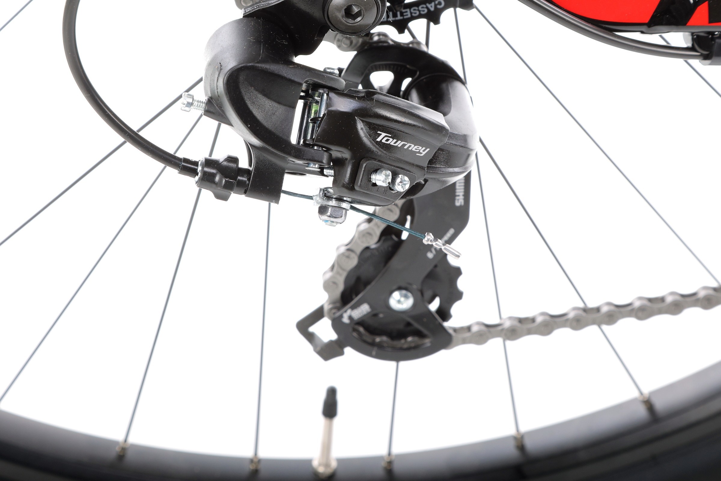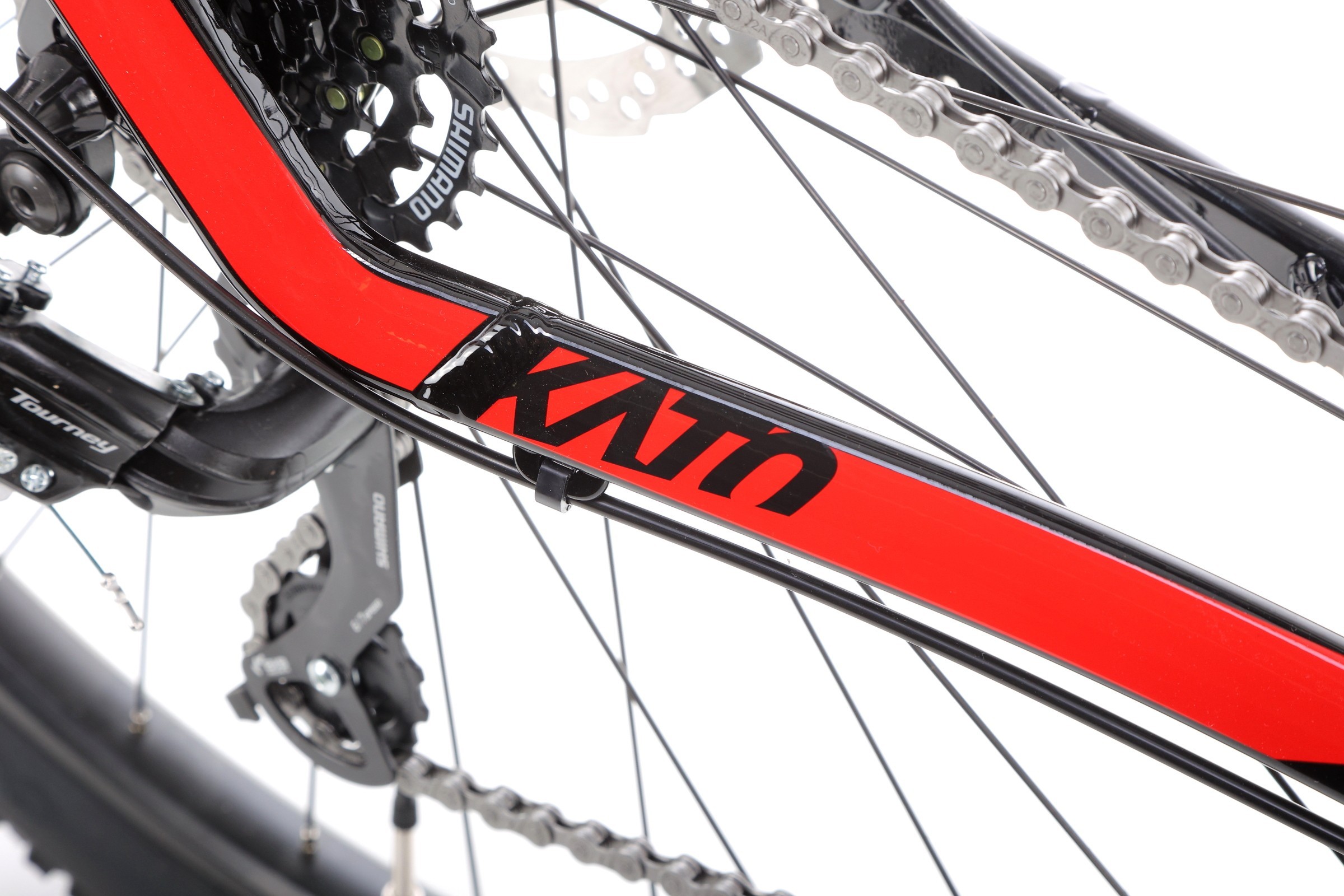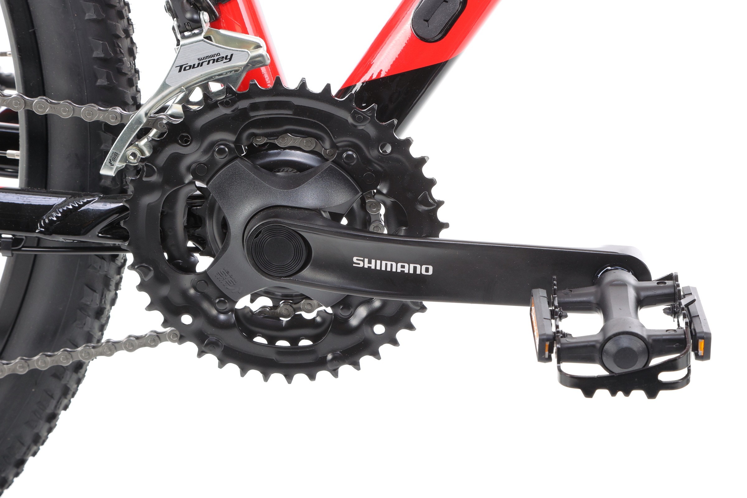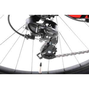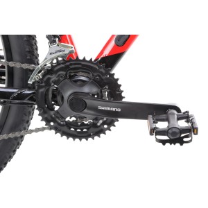 Za napęd odpowiada sprawdzony zestaw komponentów Shimano. Korba FC-TY301 (42/34/24) współpracuje z kasetą 12-32 i tworzy szeroki zakres biegów, idealny na zróżnicowany teren. Zmiana przełożeń jest szybka i bezproblemowa dzięki manetkom Altus SL-M315 oraz przerzutkom Tourney, które gwarantują płynną pracę układu.