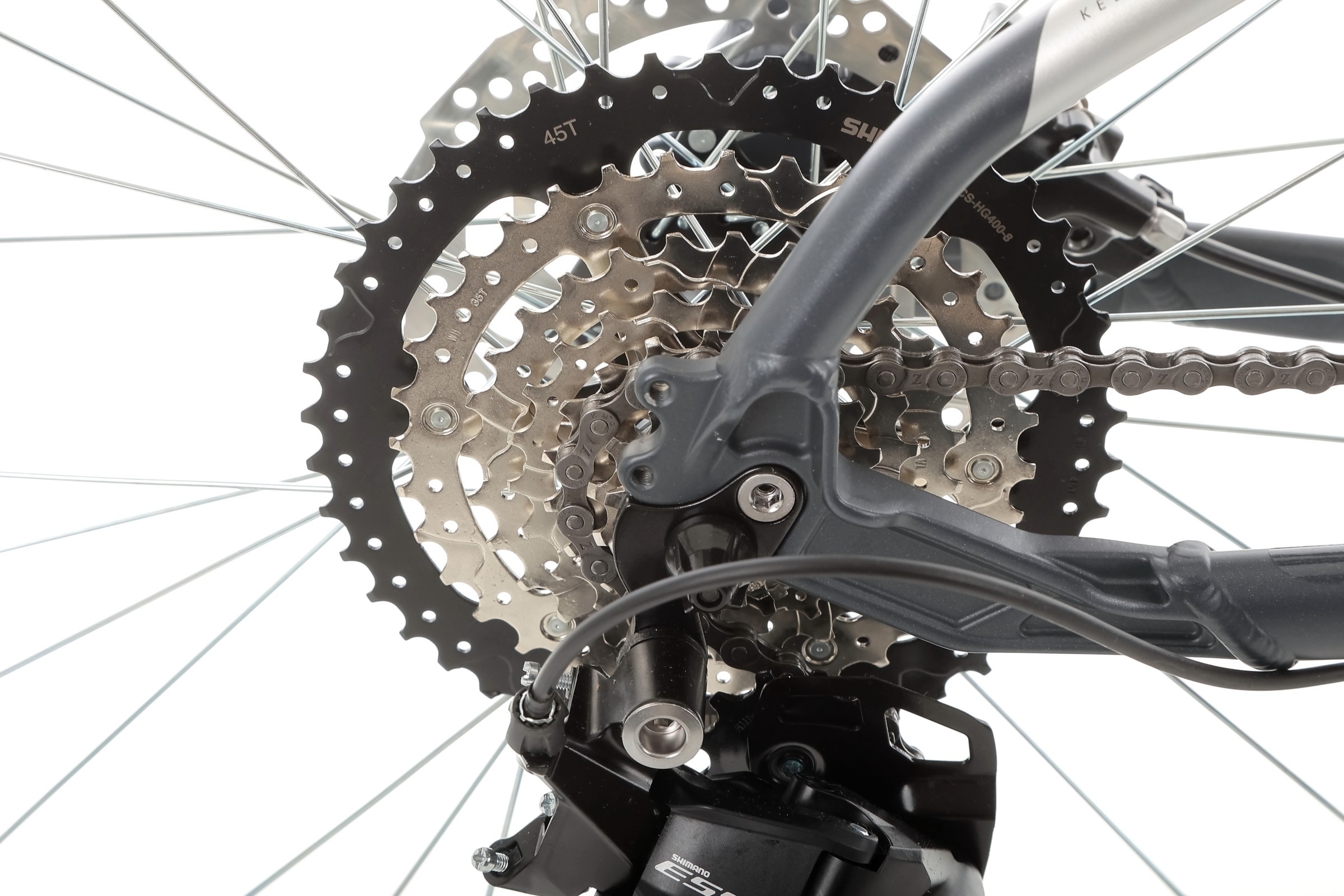Za napęd odpowiada 8-biegowa grupa SHIMANO z manetkami SL-M315-8R Rapidfire Plus oraz tylną przerzutką Essa U2000. Przełożenia 1x8 (korba 32T, kaseta 11-45T) zapewniają łatwość obsługi, szeroki zakres przełożeń i niezawodność w każdych warunkach – zarówno na podjazdach, jak i szybkich zjazdach.