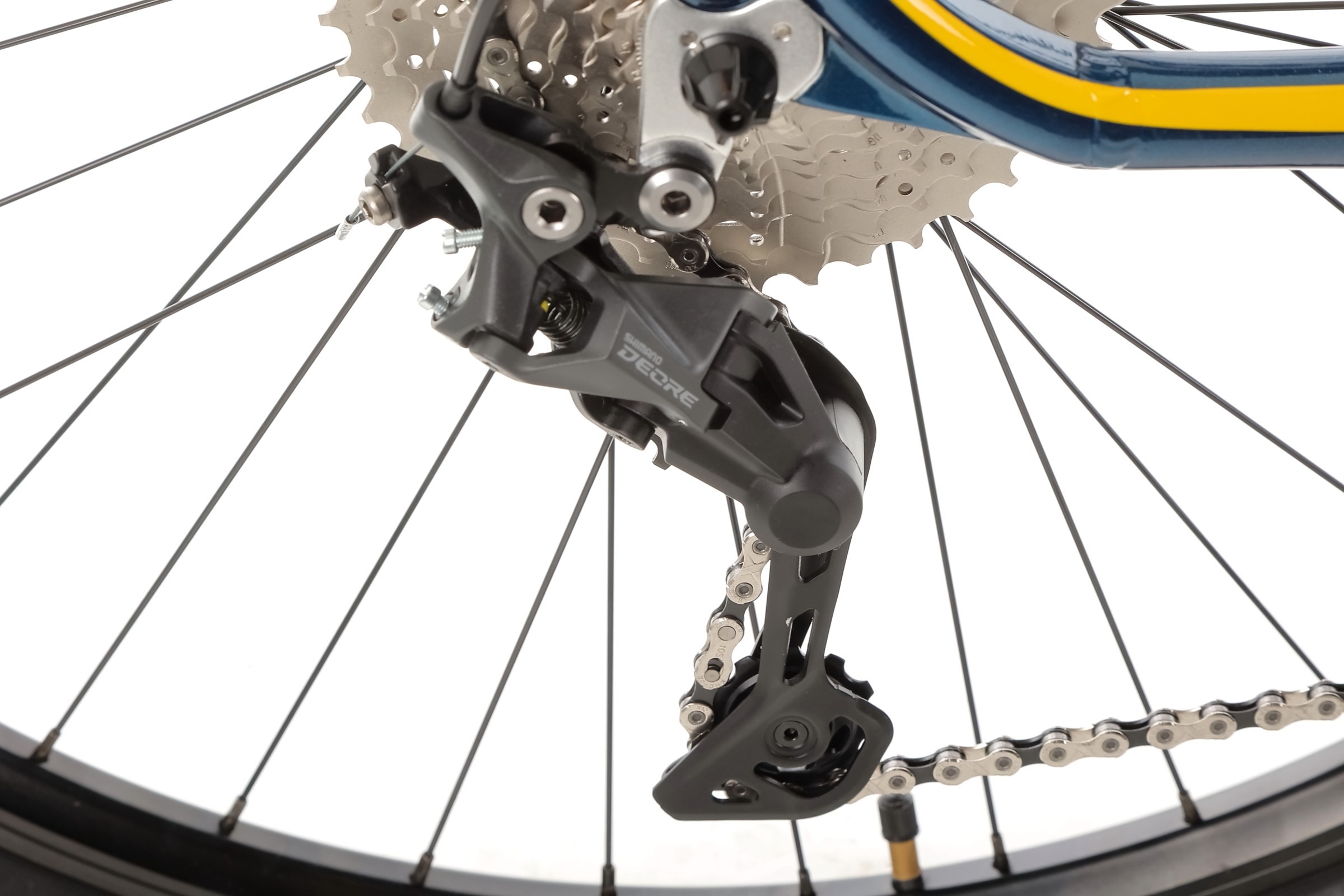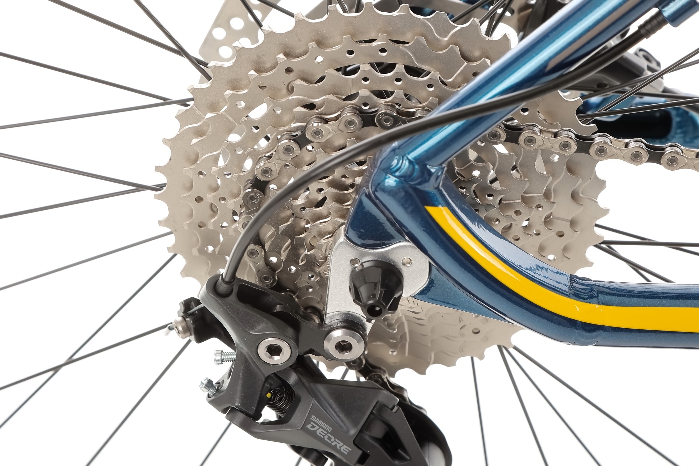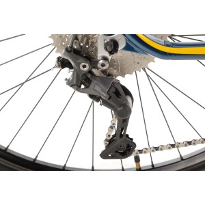 Za płynność zmiany biegów odpowiada 10-rzędowa grupa Shimano Deore – zestaw, który łączy trwałość i efektywność. Mechanizm korbowy 32T, kaseta 11-46T oraz przerzutka Shimano Deore M4120 SGS to zestaw, który sprawdzi się zarówno na podjazdach, jak i szybkich odcinkach zjazdowych. Biegi zmieniane są za pomocą niezawodnych manetek SL-M4100, co zapewnia szybką i intuicyjną obsługę.