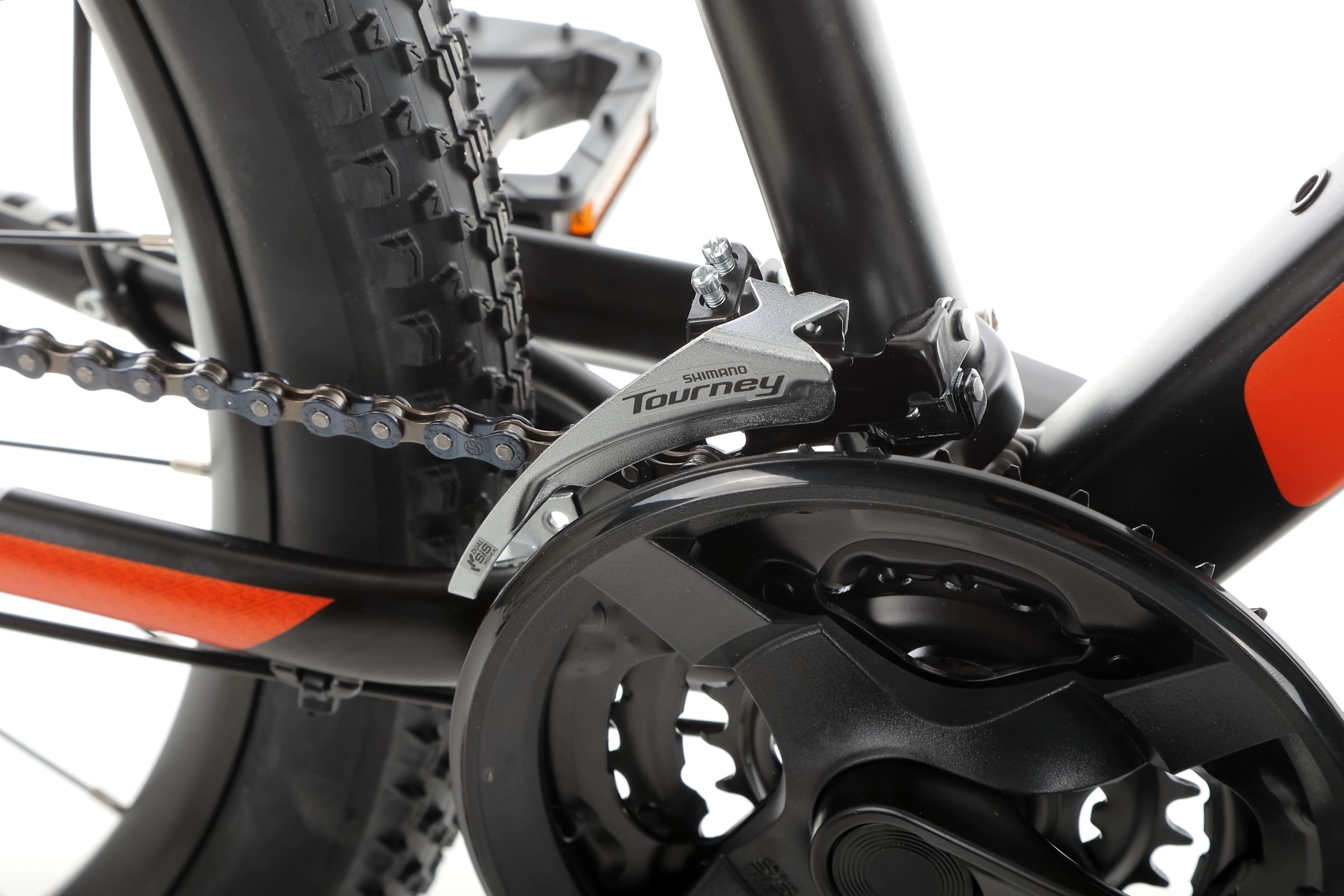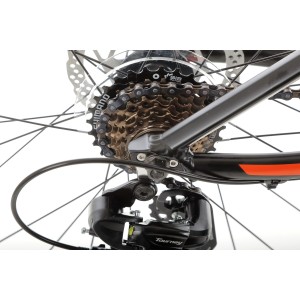 Układ napędowy oparty na komponentach Shimano to gwarancja niezawodności przez tysiące kilometrów. Duet przerzutek Tourney oraz ergonomiczne manetki ST-EF500 zapewniają szybką i cichą zmianę biegów. Szeroki wachlarz 21 przełożeń sprawia, że z łatwością dobierzesz idealny opór – niezależnie od tego, czy mierzysz się ze stromym podjazdem, czy akurat pędzisz po prostej drodze.