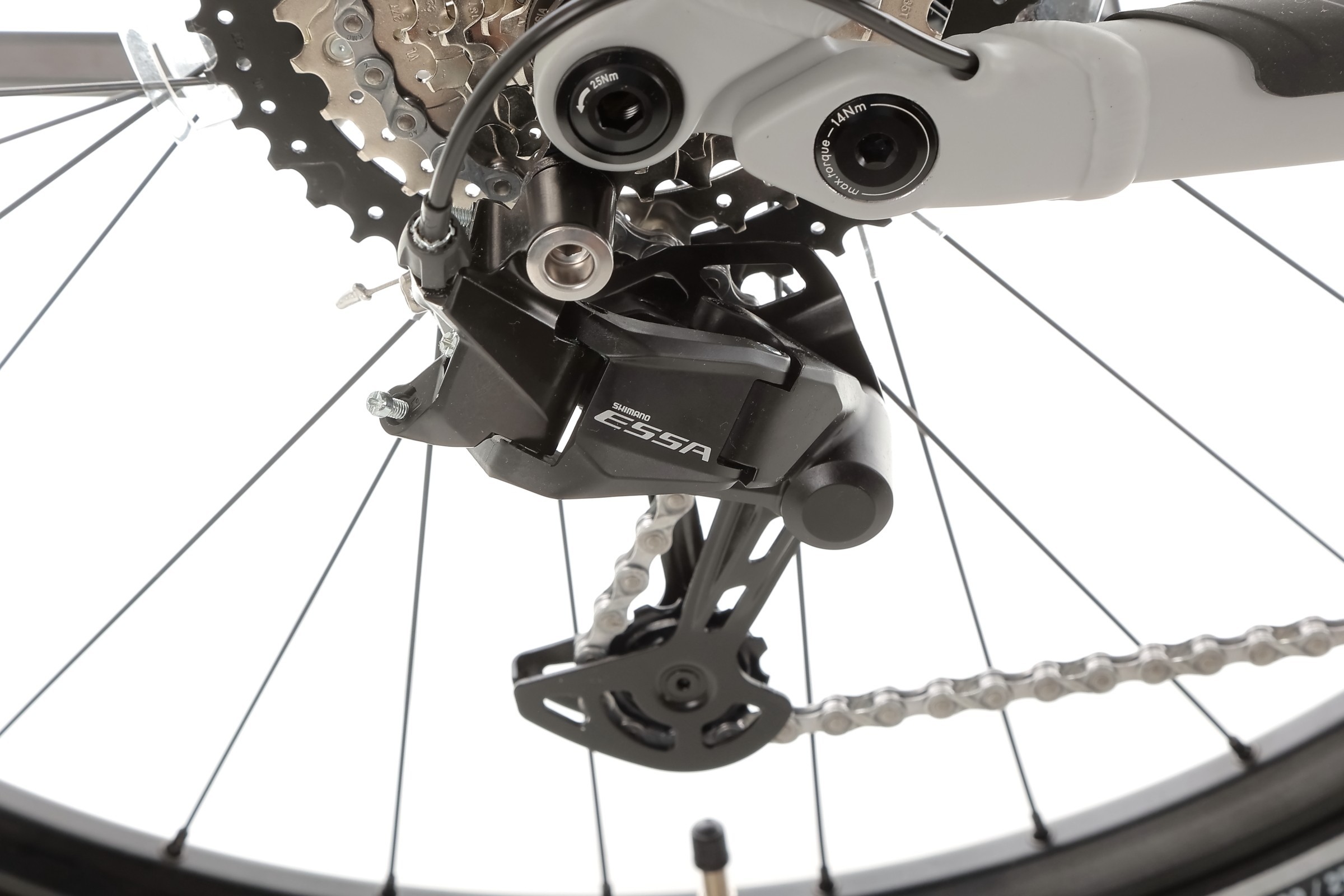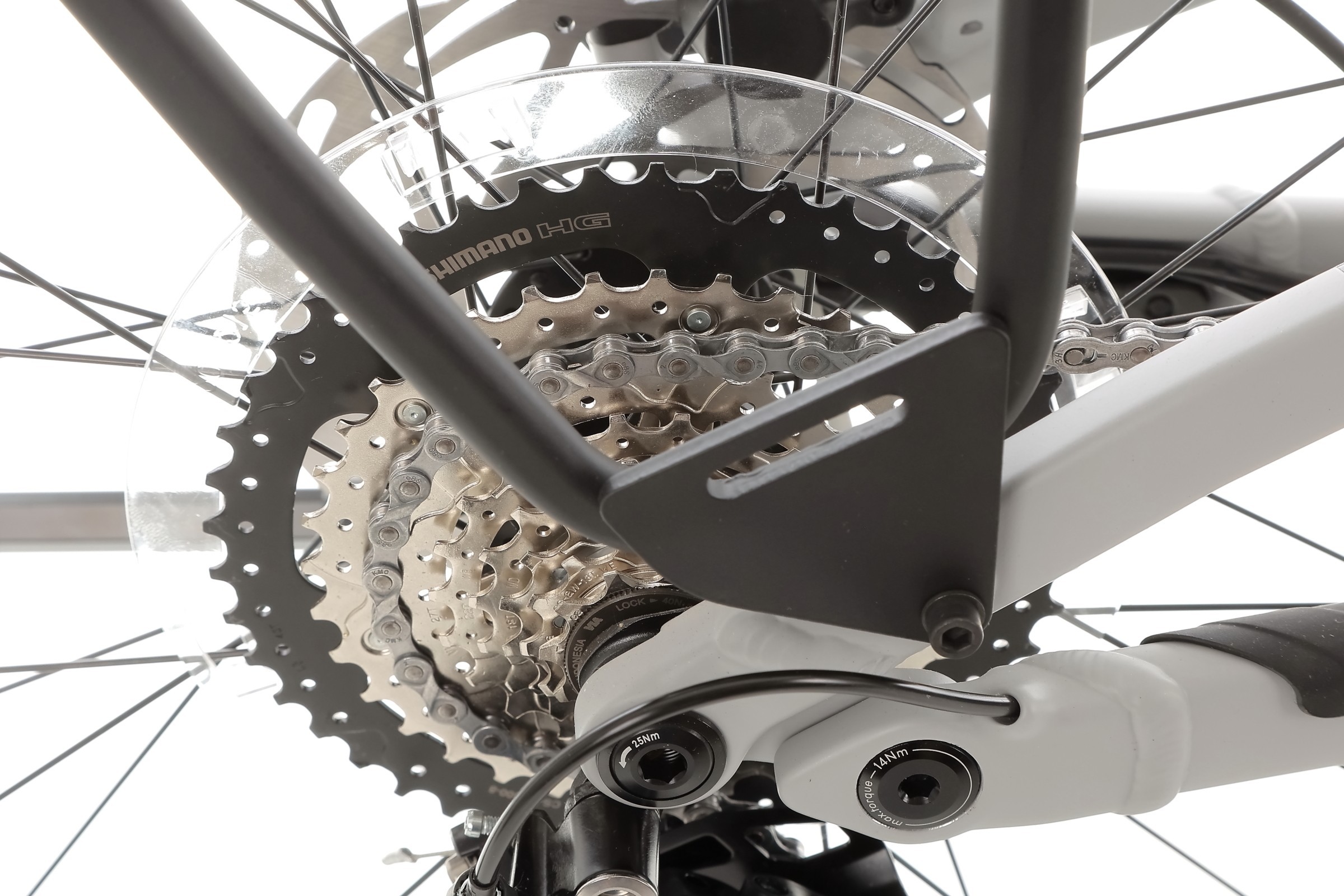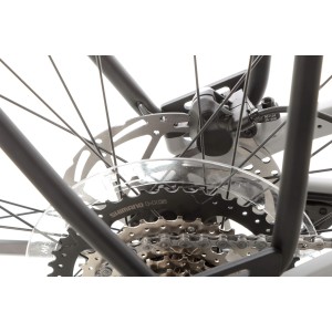 Rower wyposażono w 8-biegowy napęd Shimano, oparty na przerzutce Essa RD-U2000 oraz kasecie CS-HG400-8 o zakresie 11-45T. Taki zestaw zapewnia szeroki wachlarz przełożeń, umożliwiając komfortową jazdę zarówno po płaskim terenie, jak i stromych podjazdach. Zmiana biegów odbywa się płynnie i precyzyjnie, nawet pod większym obciążeniem, co przekłada się na lepsze osiągi i przyjemność z jazdy w każdych warunkach.