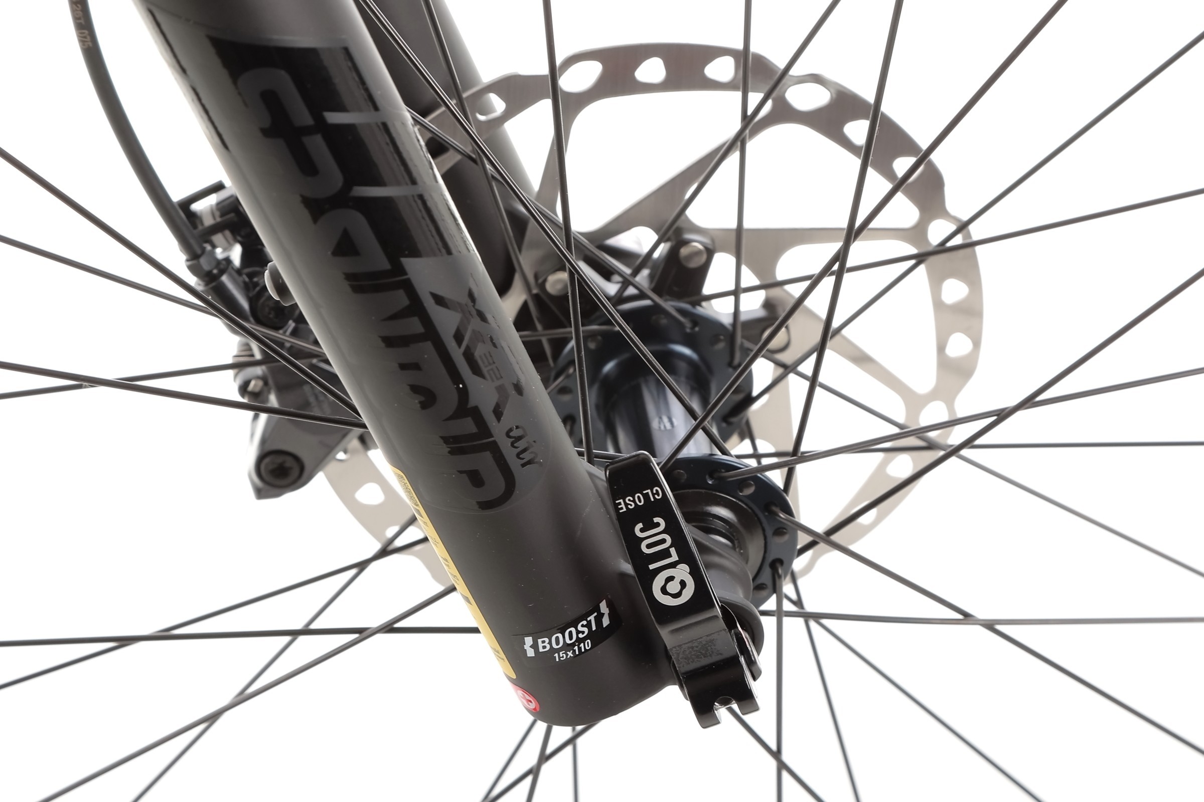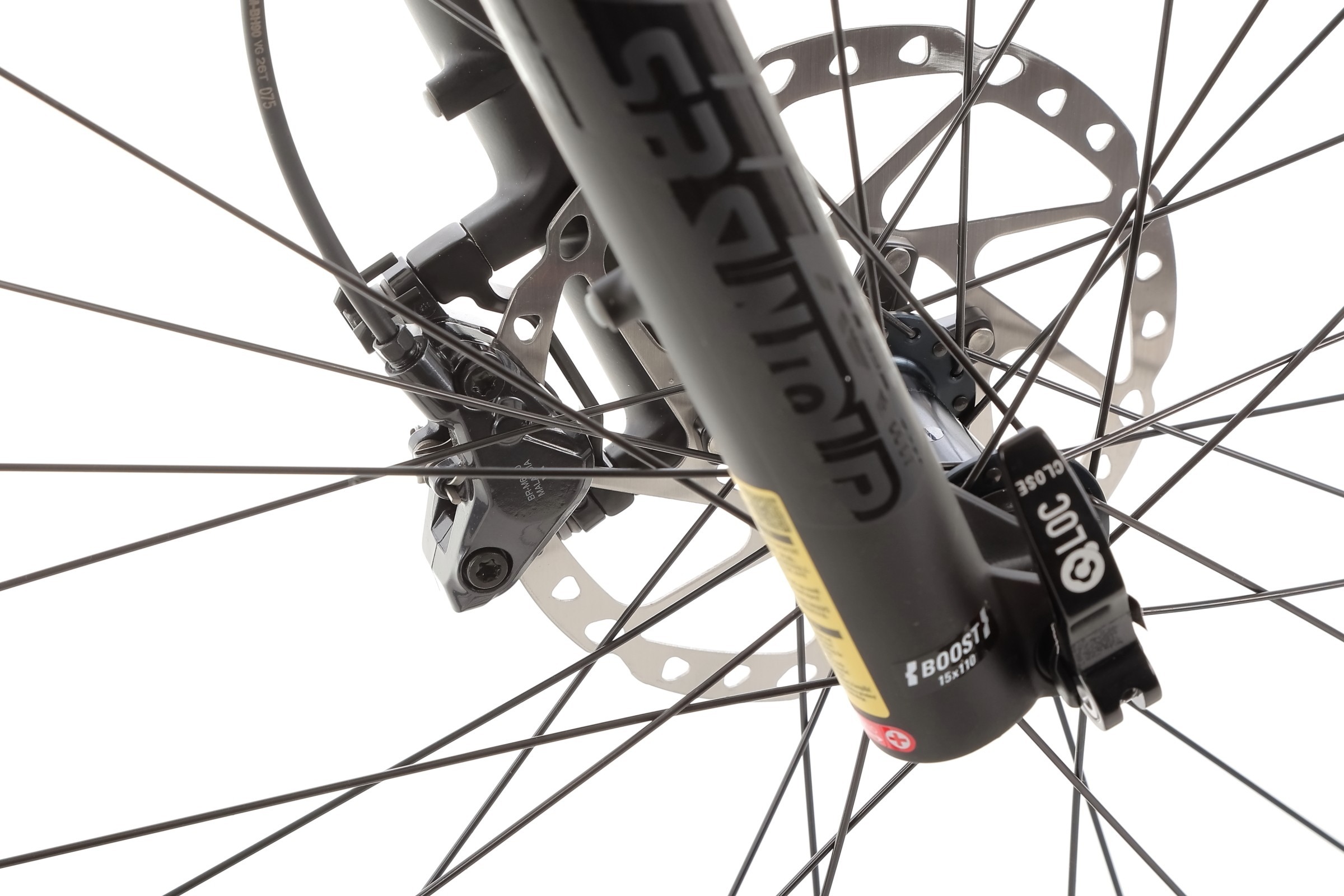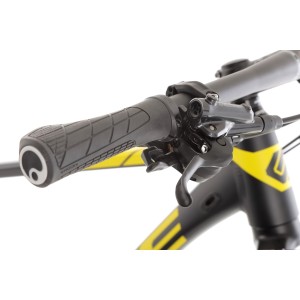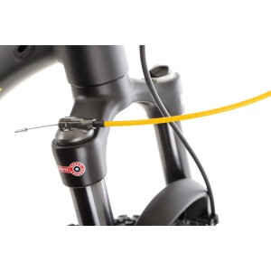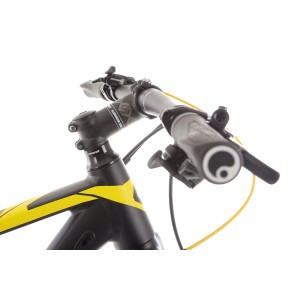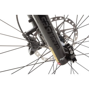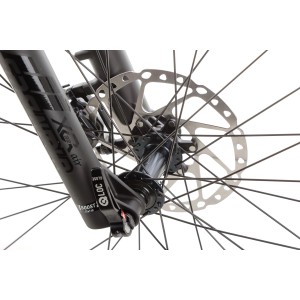 Rower wyposażony jest w widelec SR SUNTOUR XCR32 BOOST z amortyzacją powietrzną (AIR), który umożliwia precyzyjną regulację tłumienia odbicia oraz posiada hydrauliczny system blokady z dźwignią na kierownicy. Skok amortyzatora wynosi 100 mm, a oś to M15, co gwarantuje skuteczne tłumienie nierówności i komfort podczas jazdy terenowej.