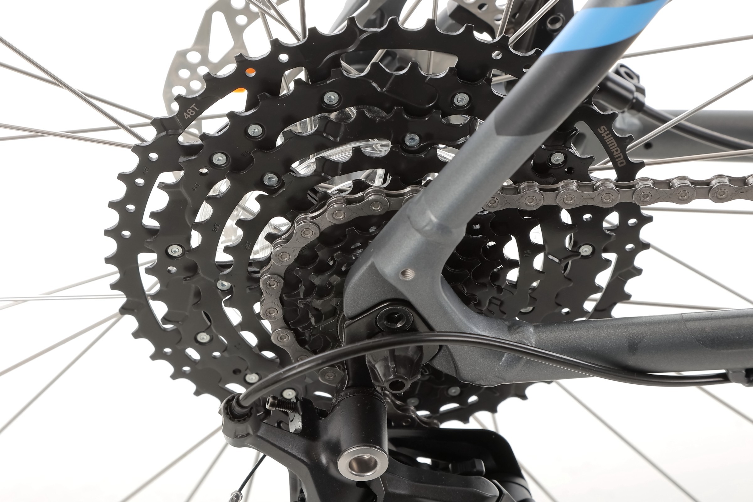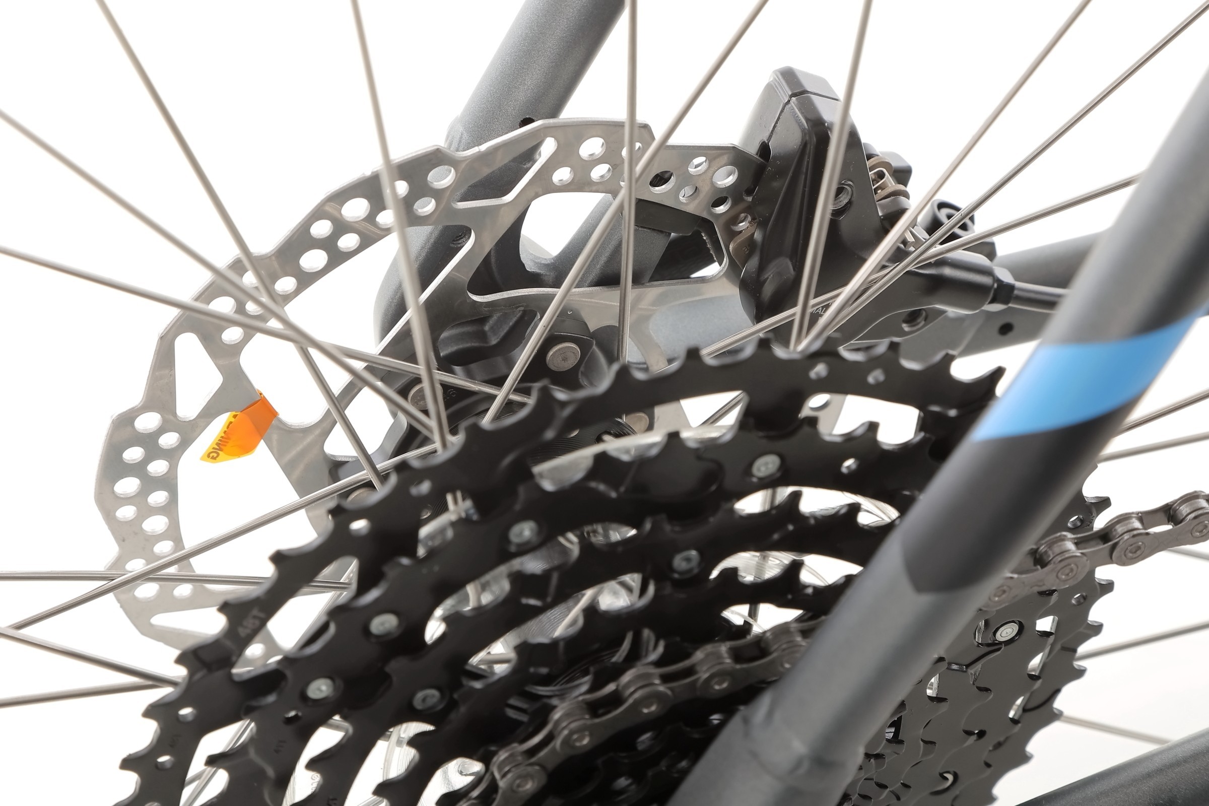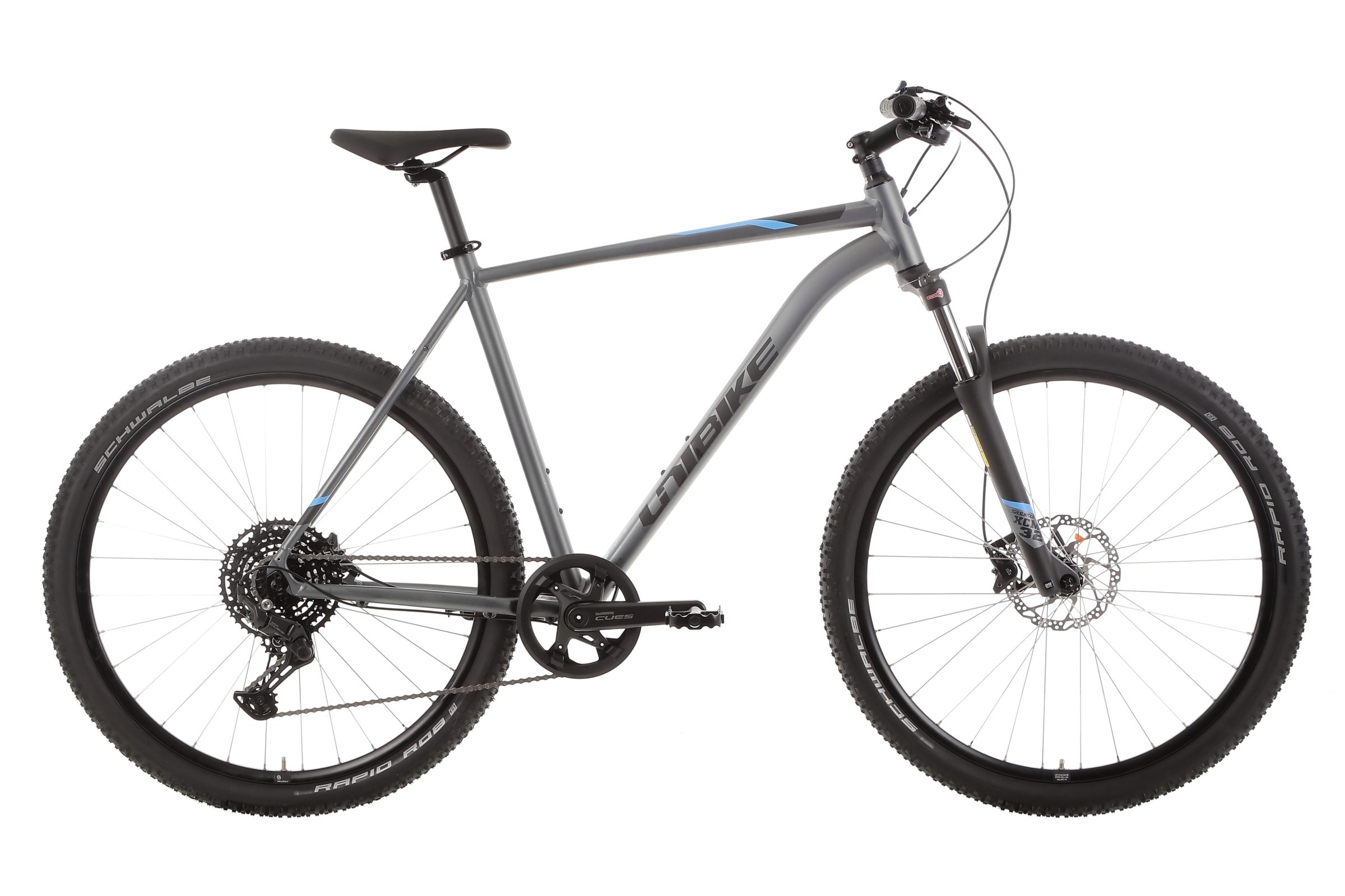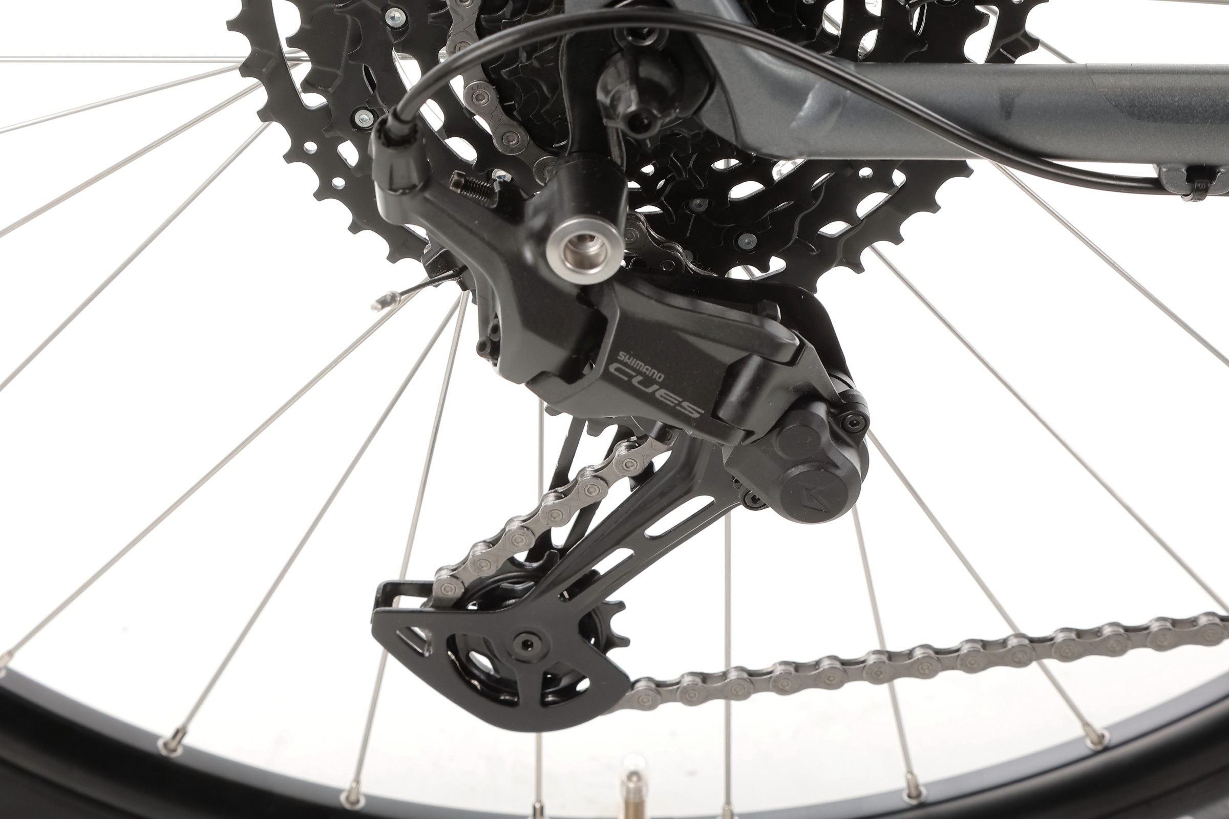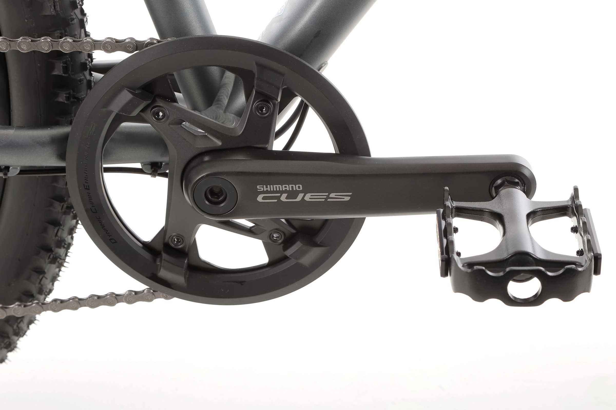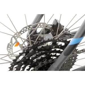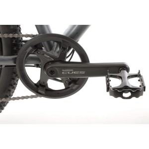 Rower wyposażono w nowoczesny napęd SHIMANO CUES U6000, obejmujący korbę z tarczą 42T, zintegrowaną oś oraz osłonę. 10-rzędowa kaseta SHIMANO CUES LG300-10 (11-48T) w połączeniu z łańcuchem KMC XGLIDE gwarantuje szeroki zakres przełożeń, płynną zmianę biegów i niezawodność w każdych warunkach terenowych.
