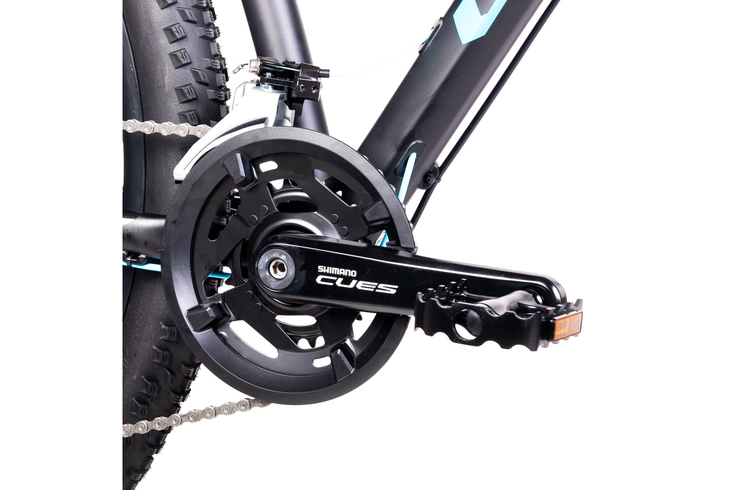 Rower wyposażono w nowoczesny napęd SHIMANO CUES – korba U4010 (40x26T), przerzutki U4000 (przód) i U6020-10 (tył), a także kasetę LG300-10 (11-39T). Taki zestaw pozwala na płynną zmianę aż 20 przełożeń, co ułatwia pokonywanie różnorodnych tras. Łańcuch KMC XGLIDE zapewnia trwałość i niezawodność.