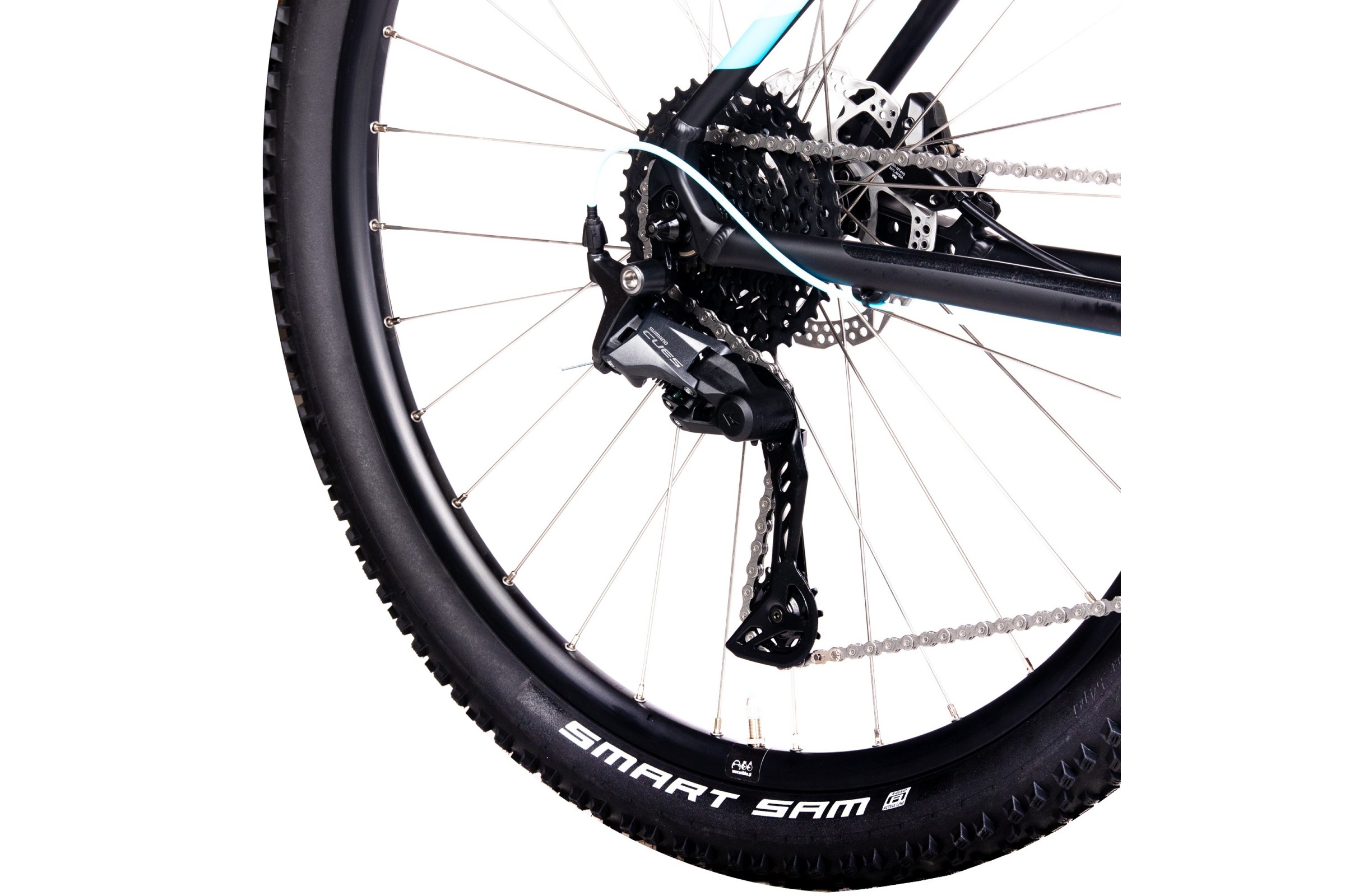 Na rowerze zamontowano koła 29" z obręczami STARS DISC oraz piastami SHIMANO QC300. Opony SCHWALBE SMART SAM 29x2.25 gwarantują doskonałą przyczepność i komfort jazdy zarówno w mieście, jak i w terenie.