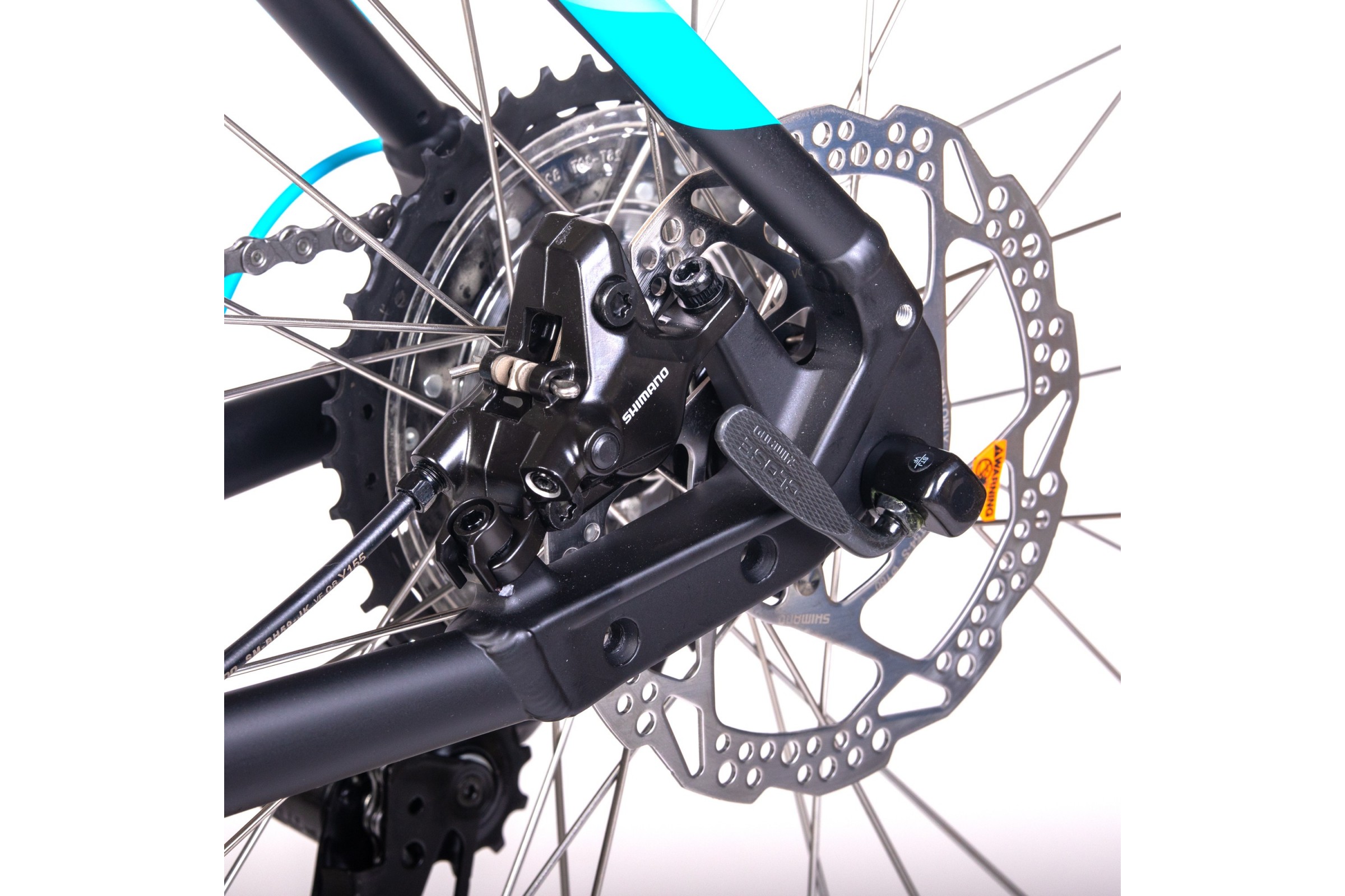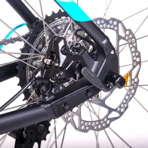 Bezpieczeństwo zapewniają hydrauliczne hamulce tarczowe SHIMANO MT410. Gwarantują one skuteczne hamowanie w każdych warunkach pogodowych, zarówno na suchych, jak i mokrych nawierzchniach. To pewność kontroli nad rowerem nawet podczas dynamicznej jazdy.