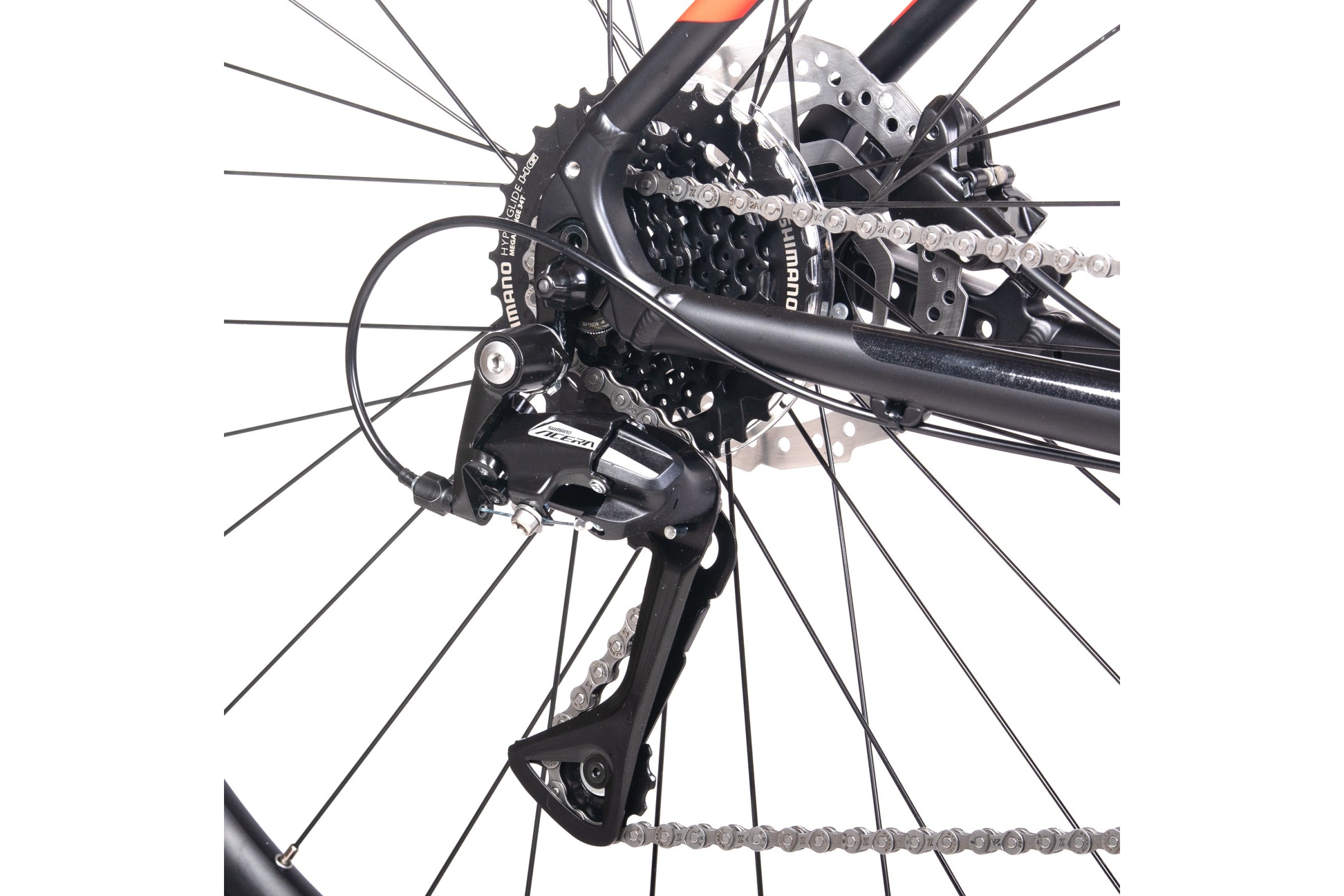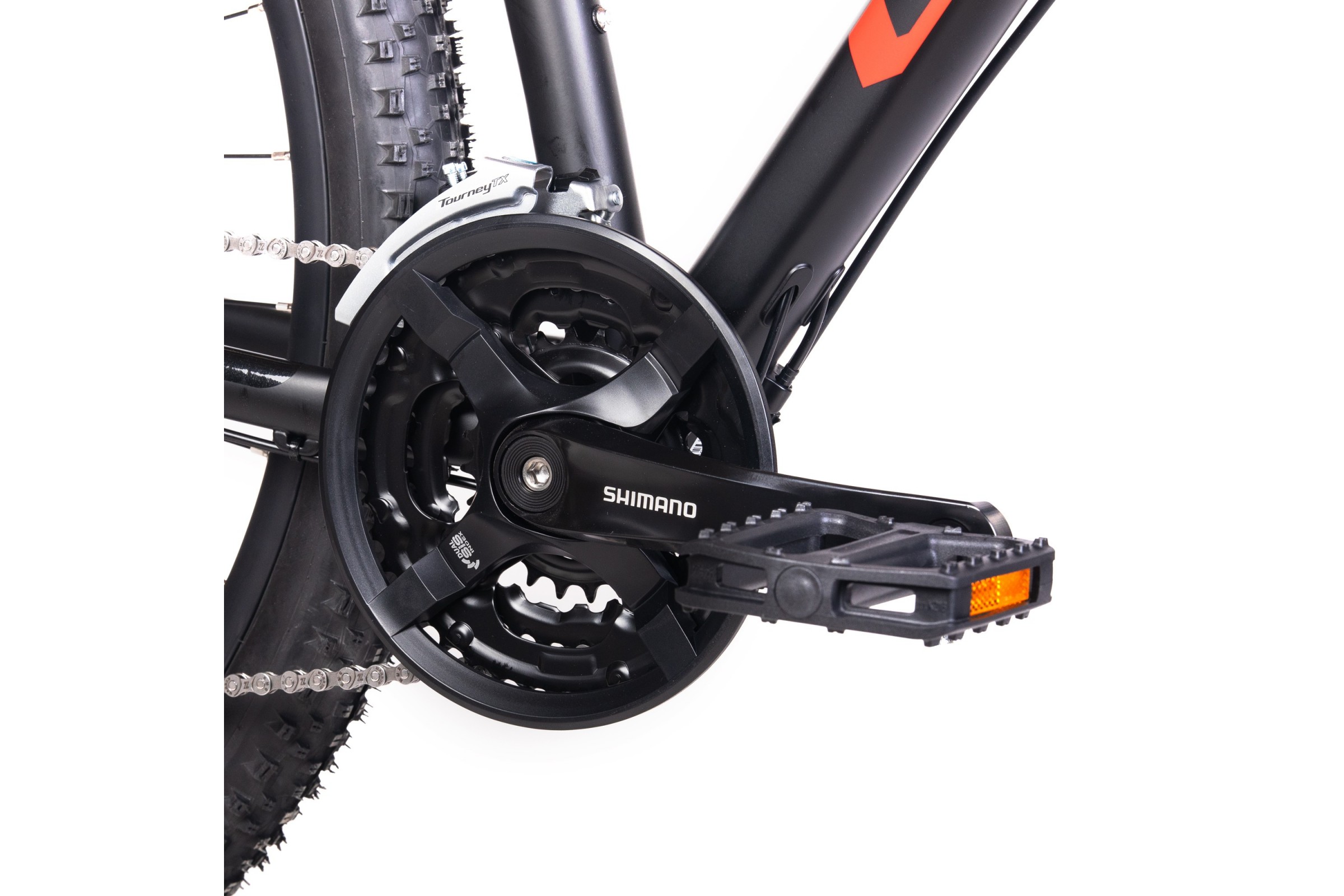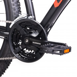 System napędowy oparty na komponentach SHIMANO: korbie TY501 (42x34x24T) z osłoną, przedniej przerzutce Tourney TX800, tylnej Acera M3020-8 oraz kasecie HG31 (11-34T), zapewnia płynną i precyzyjną zmianę przełożeń. Szeroki zakres biegów pozwala łatwo pokonywać podjazdy i rozwijać prędkość na prostych odcinkach.