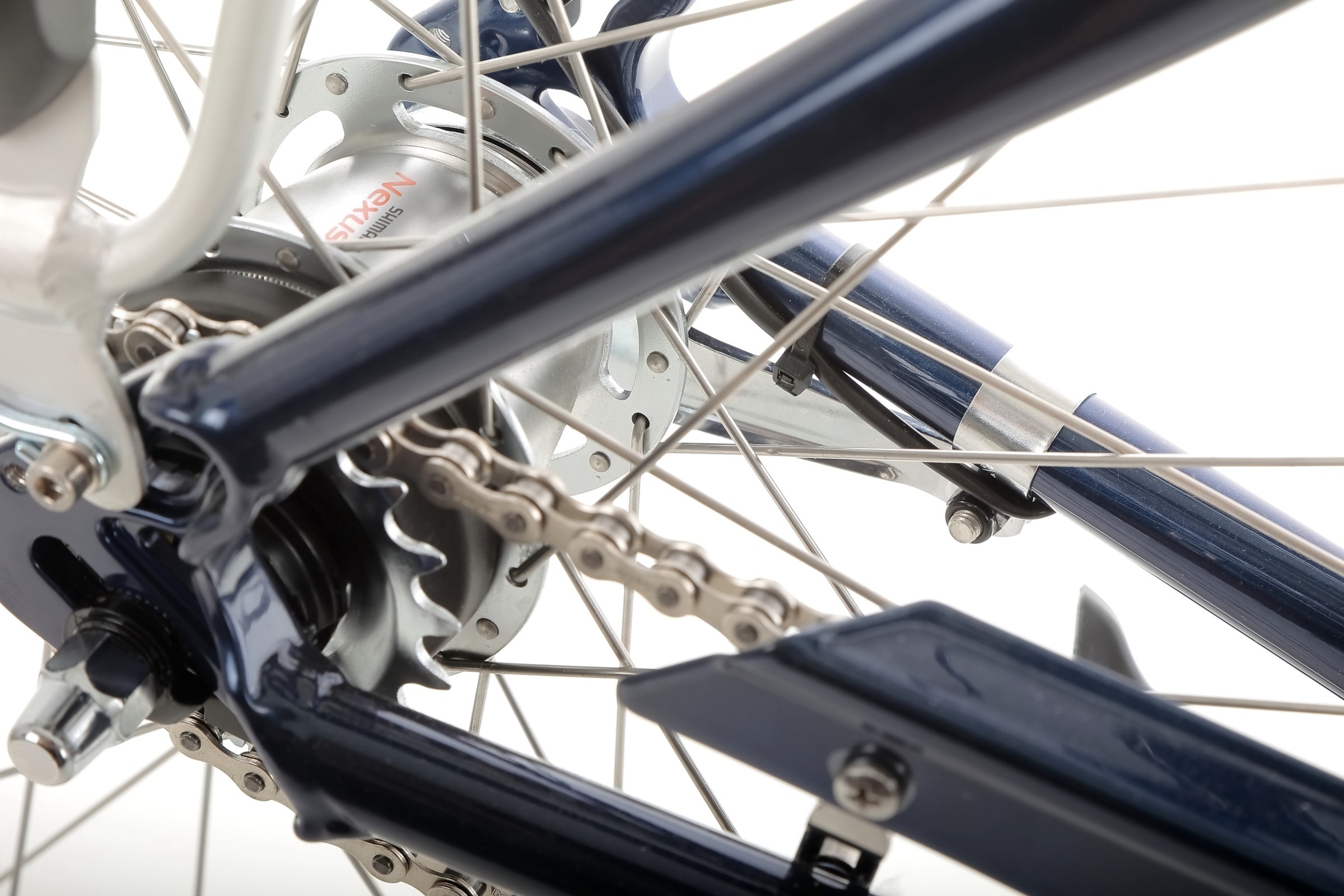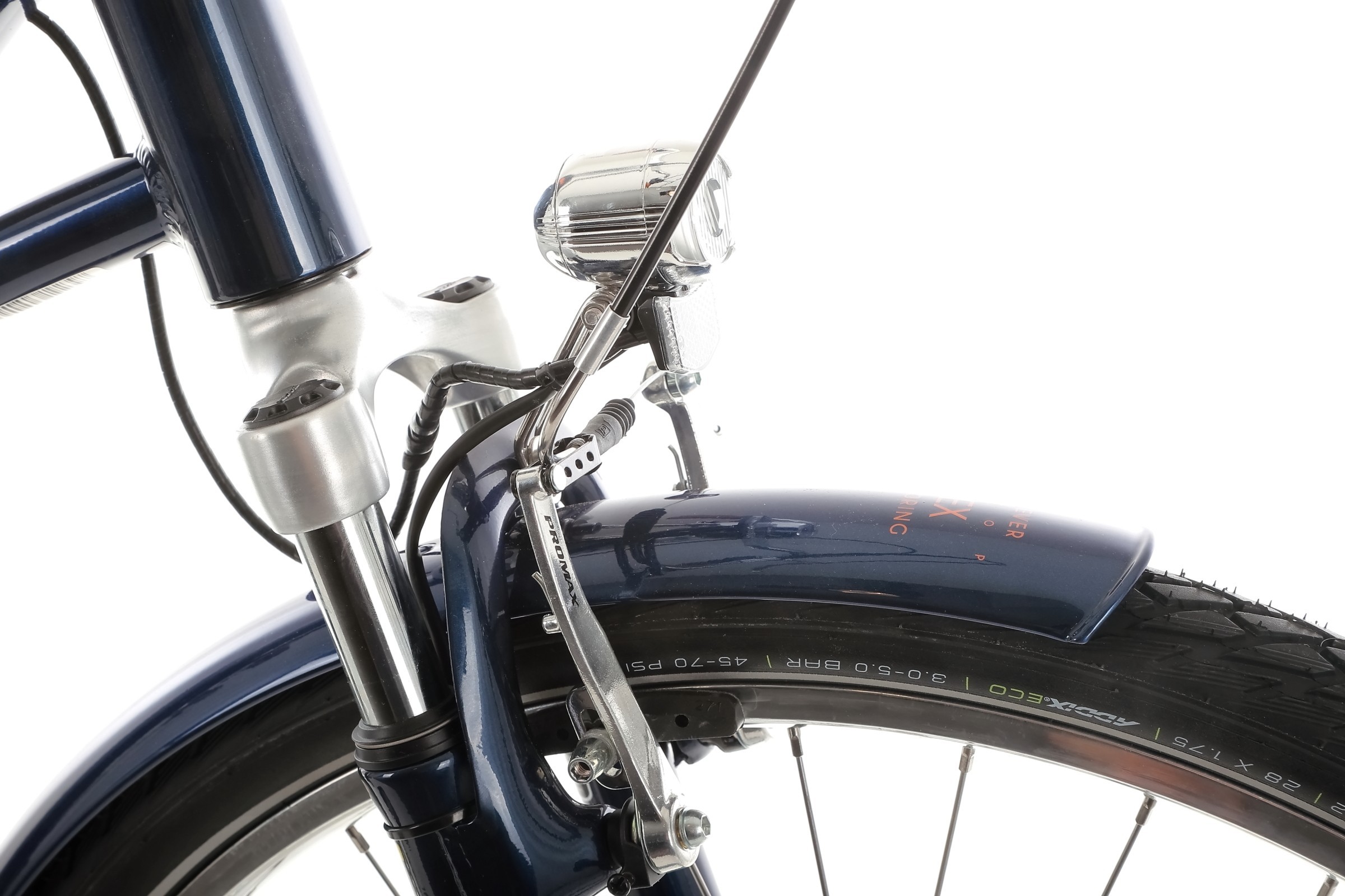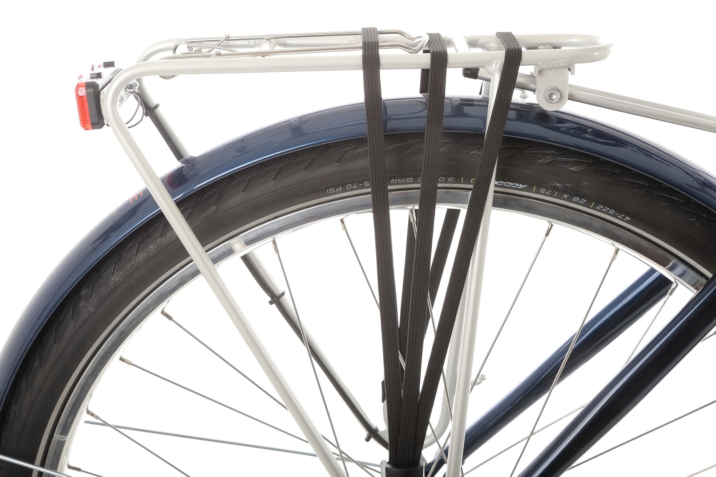 Rower wyposażono w piasty Shimano – z przodu z prądnicą DH-C3000, a z tyłu z 7-biegowym systemem Nexus, co zapewnia płynność i trwałość jazdy. Całość uzupełniają opony Schwalbe HS620 28×1,75, które gwarantują pewne prowadzenie, niskie opory toczenia i wysoką odporność na przebicia, idealnie sprawdzając się w miejskich warunkach.