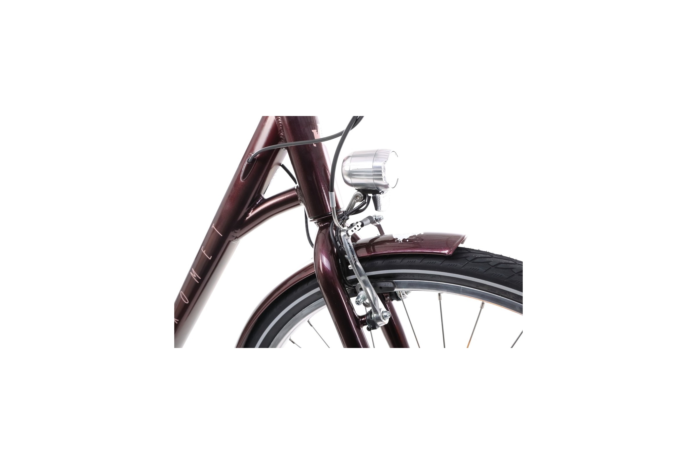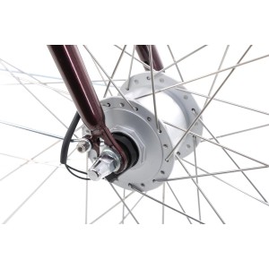 Romet Pop Art Lux posiada koła o średnicy 28 cali z aluminiowymi dwukomorowymi obręczami, które łączą w sobie lekkość i wysoką odporność na uszkodzenia. Opony 28×1,75 gwarantują komfortową jazdę zarówno po asfalcie, jak i po miejskich ścieżkach rowerowych. Przednia piasta z dynamem Shimano zapewnia zasilanie oświetlenia bez konieczności ładowania baterii.