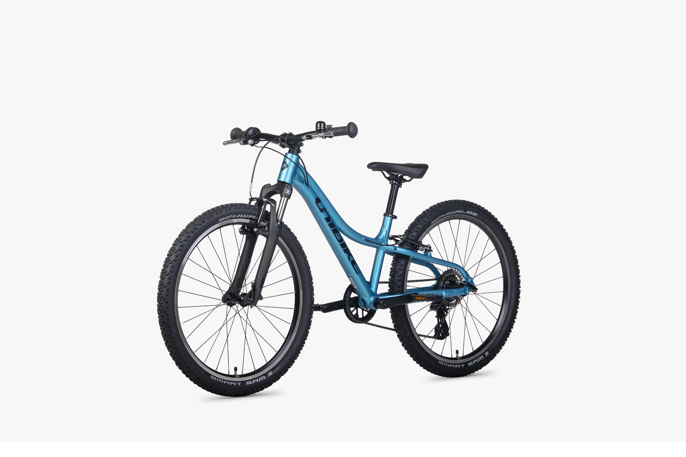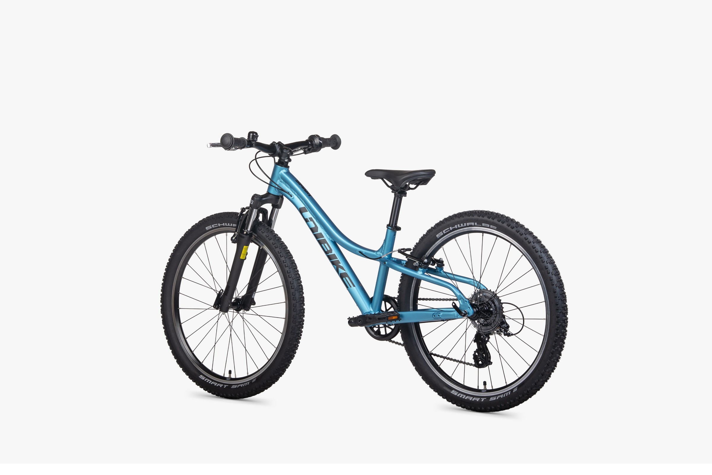 Rower porusza się na kołach 24-calowych, zaplecionych na piastach KT Quando i solidnych obręczach. Jednak prawdziwą gwiazdą są tu opony Schwalbe Smart Sam 24x2.10. To jedne z najlepszych opon uniwersalnych na rynku – ich gęsty środek bieżnika pozwala na szybką jazdę po asfalcie, a agresywne klocki boczne zapewniają doskonałe trzymanie w zakrętach na piachu i błocie.