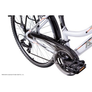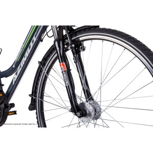 Damski rower trekingowy Azimut Trekking 2.0 D został zbudowany na aluminiowej ramie Romet Trekking Comfort Geometry, Alu 6061 co gwarantuje przyjemną i wygodną jazdę. Rama została stworzona tak, aby sprostać wymaganiom każdej rowerzystki. Jest to idealna propozycja na dłuższe wycieczki a także na całkiem poważne wyprawy. Za pełny komfort jazdy odpowiada amortyzator przedni SrSuntour M3010, 50mm skoku a także wygodne i szerokie sidło Selle Royal. Spektrum 21 przełożeń pozwoli na poruszanie się bez najmniejszego problemu w każdym terenie. Dzięki dużym kołom 28" rower stawia bardzo małe opory toczenia. Aluminiowy wspornik kierownicy z regulacją wysokości oraz kąta jej nachylenia pozwala na idealne dopasowanie roweru do potrzeb przyszłego użytkownika. Zamontowane wyposażenie dodatkowe (takie jak: bagażnik, błotniki, podpórka, osłona łańcucha oraz pełne oświetlenie) czynią z tego roweru pewne i sprawdzone narzędzie do wielokilometrowych wyjazdów czy codziennych dojadów do pracy. Ciekawym dodatkiem jest również bezoporowa prądnica marki Shimano umieszczona w przedniej piaście roweru. Rower trekkingowy Azimut Trekking 2.0 D został wyprodukowany w polskiej fabryce z zachowaniem najwyższych standardów jakości.