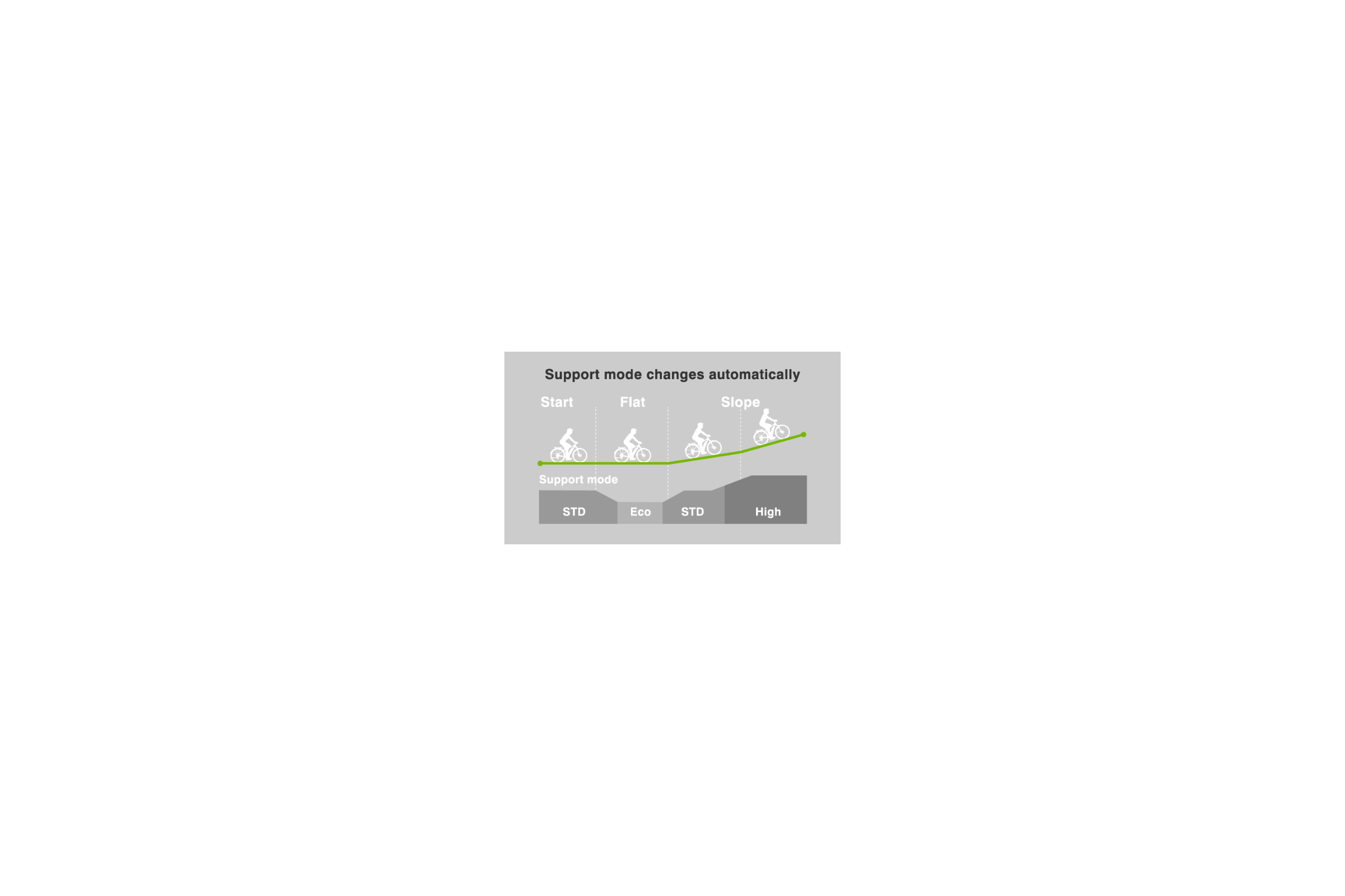 Tryby wspomagania: HIGH (280%)/ STD (190%) / ECO (100%) / +ECO (50%) / AUTOMATIC