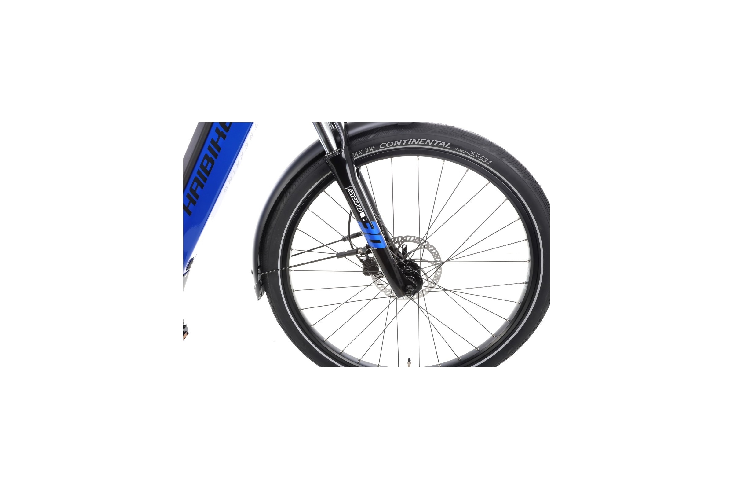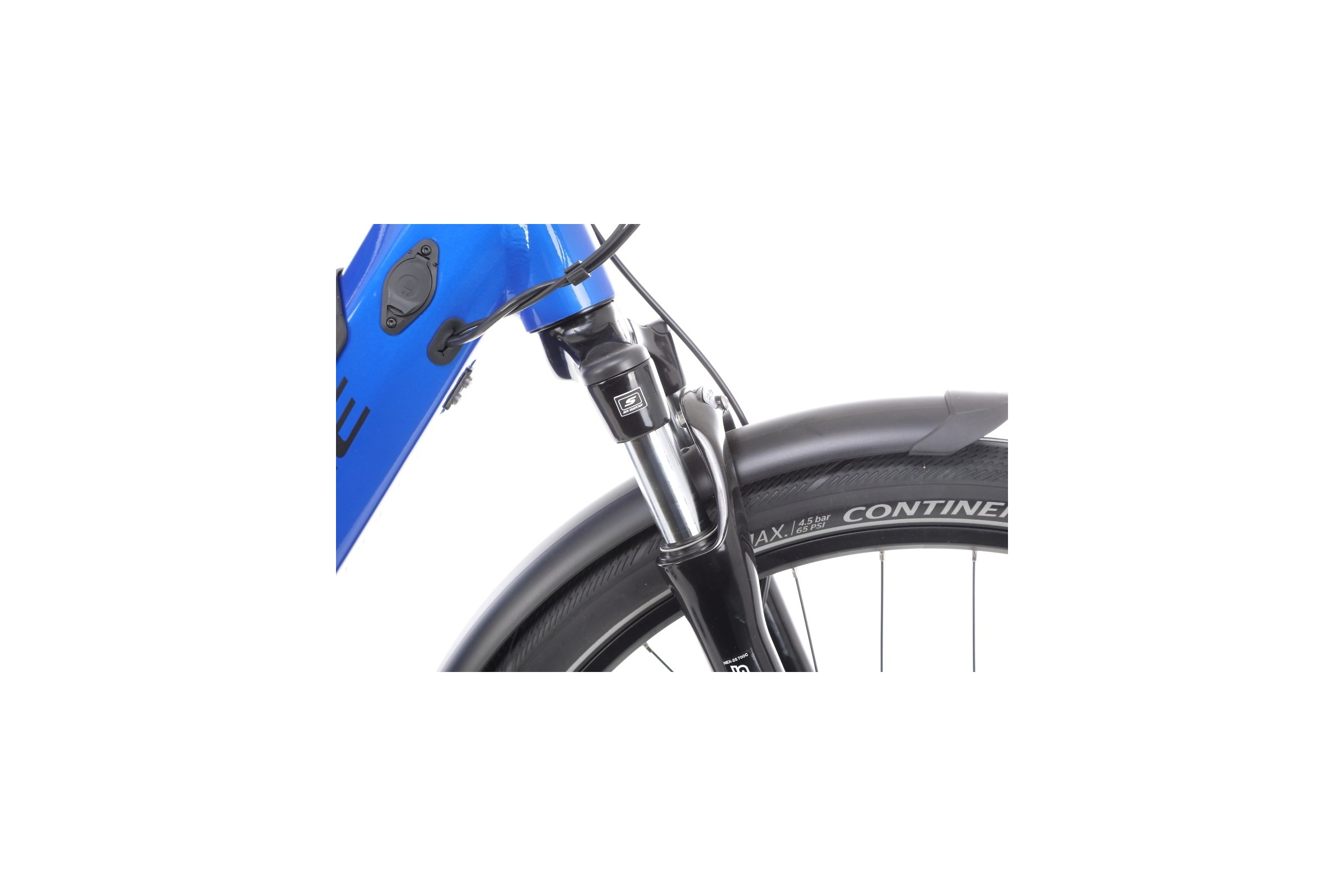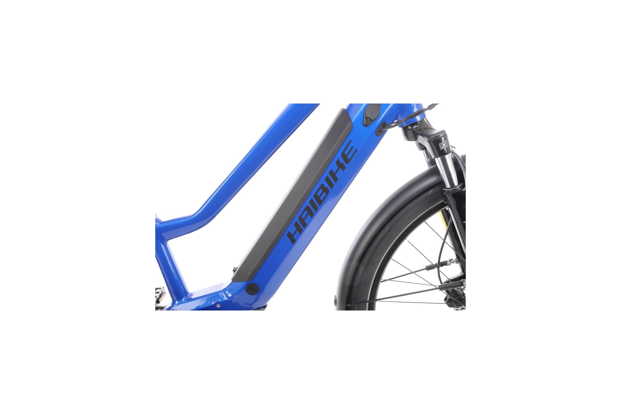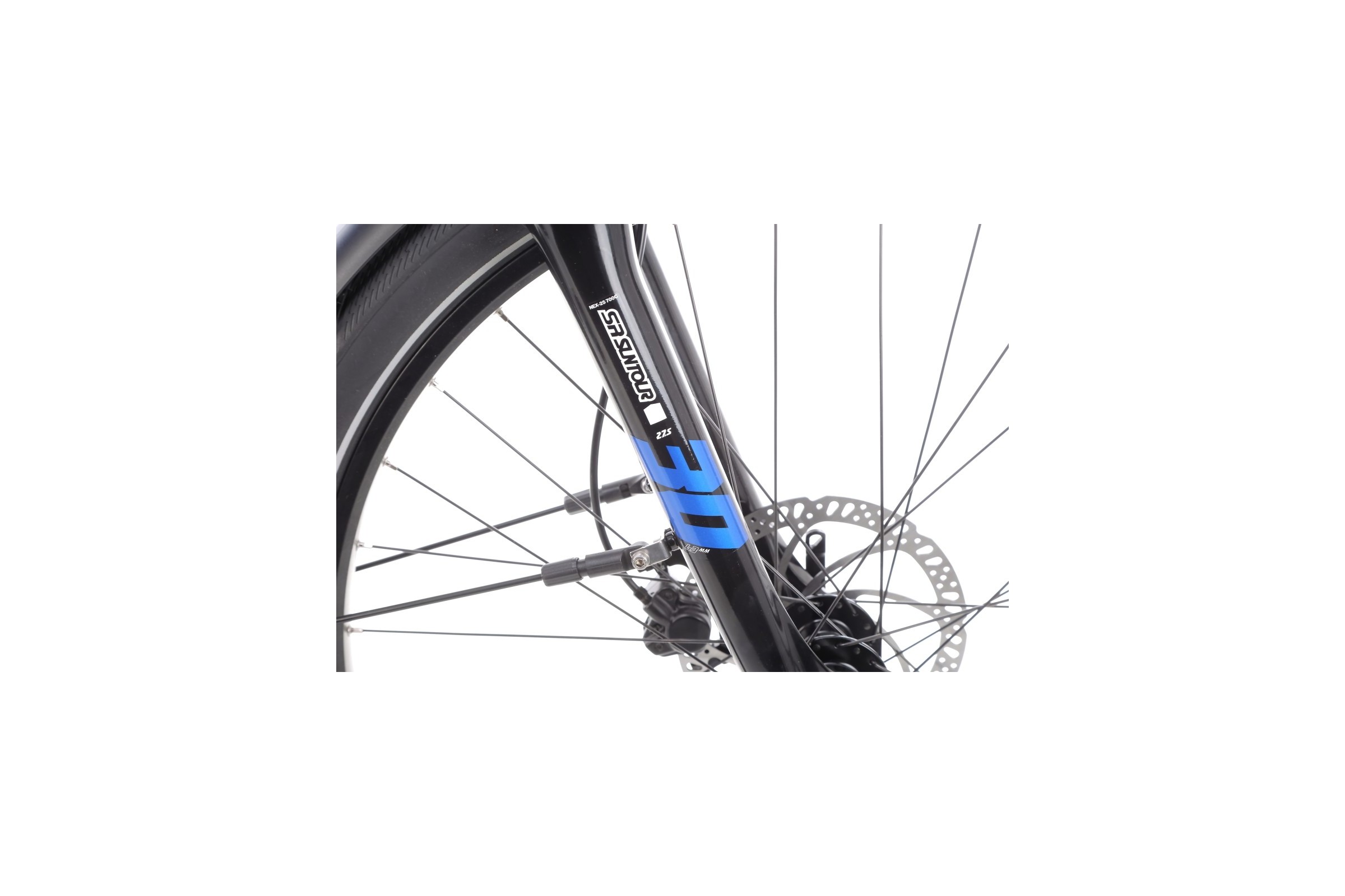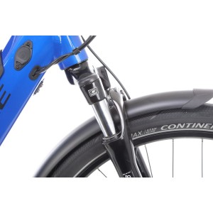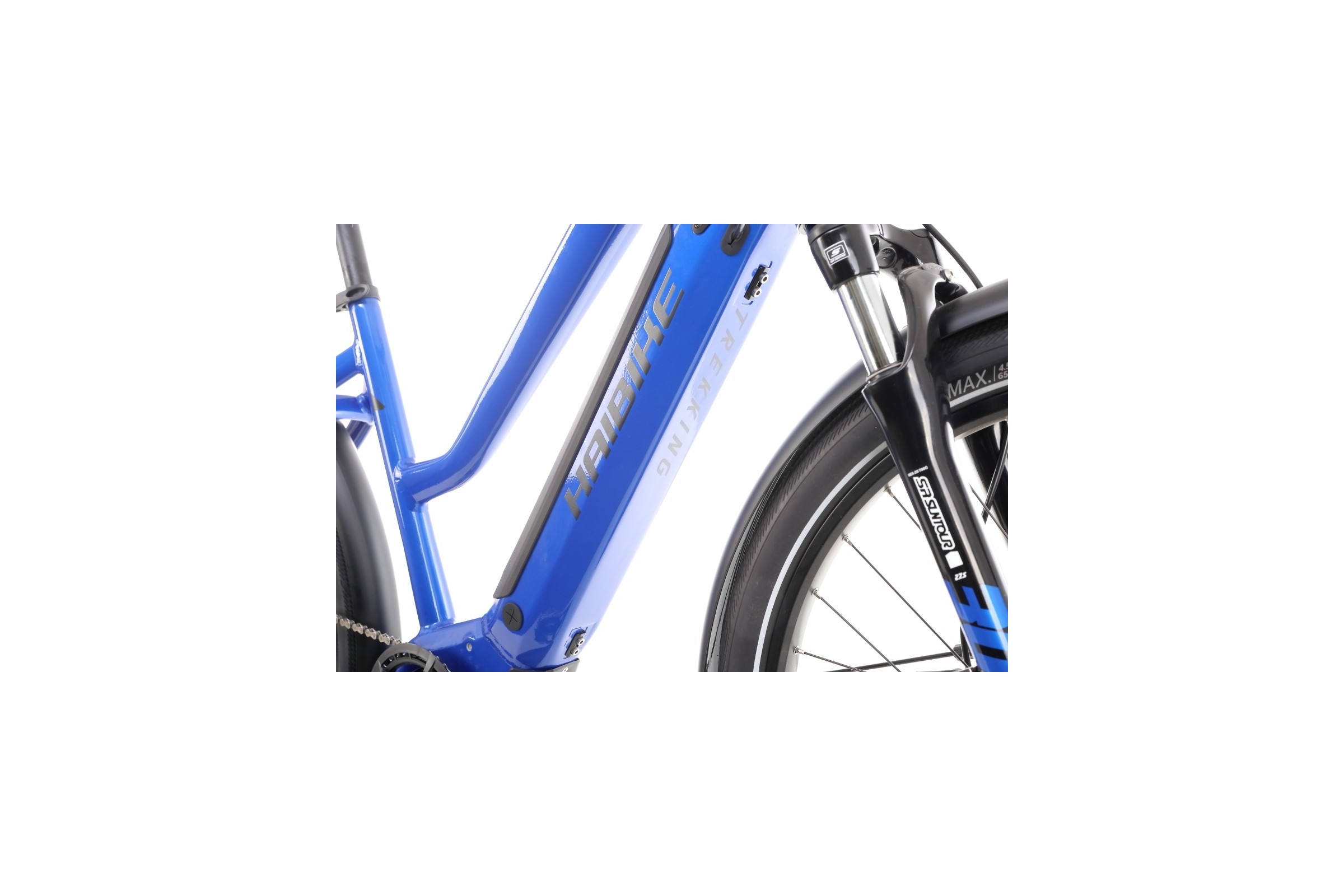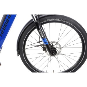 Trekking 4 zastosowano amortyzator przeznaczony do rowerów elektrycznych - SR SunTour NEX E-25. Jest to lekki a zarazem wytrzymały amortyzator sprężynowy z dolną konstrukcją monocoque wykonaną z aluminium i goleniami o średnicy 30mm. Charakteryzuje się także 63 mm ugięciem. Taki amortyzator idealnie sprawdzi się w rekreacyjnym zastosowaniu więc jest właściwym wyborem w e-rowerze jak Haibike Trekking 4.