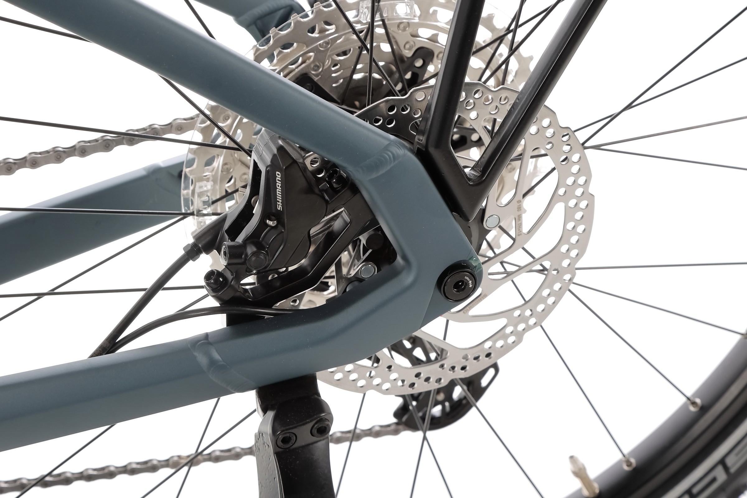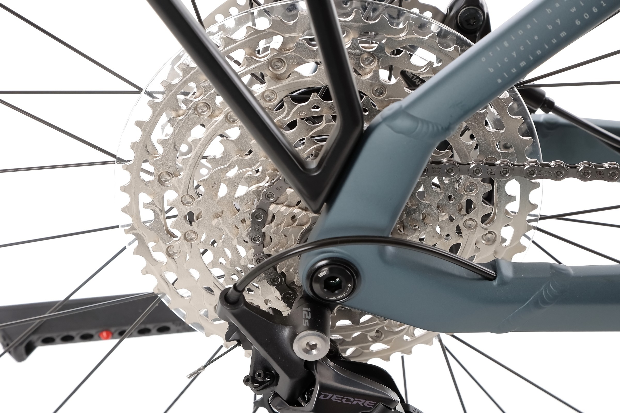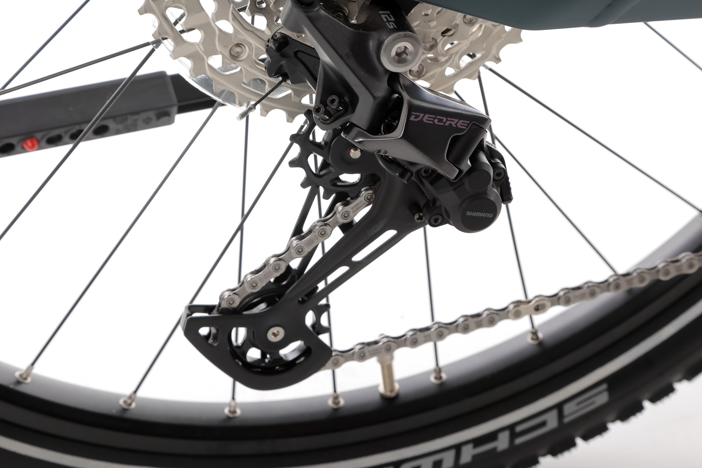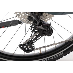 Rower został wyposażony w 12 rzędową przerzutkę tylną Shimano Deore M6100, która niezawodnie współpracuje z modułem elektrycznym roweru. Zapewnia ona zaawansowaną wydajność zmiany przełożeń przy mniejszym napięciu na niskim przełożeniu. Większe kółka 13T poprawiają wydajność i prowadzenie łańcucha, a kompatybilność z nowymi 12-rzędowymi kasetami SHIMANO zwiększa zakres przełożeń. Niskoprofilowa konstrukcja zapobiega uszkodzeniom przez kamienie a stabilizator łańcucha ogranicza spadanie, uderzanie i głośną pracę łańcucha.