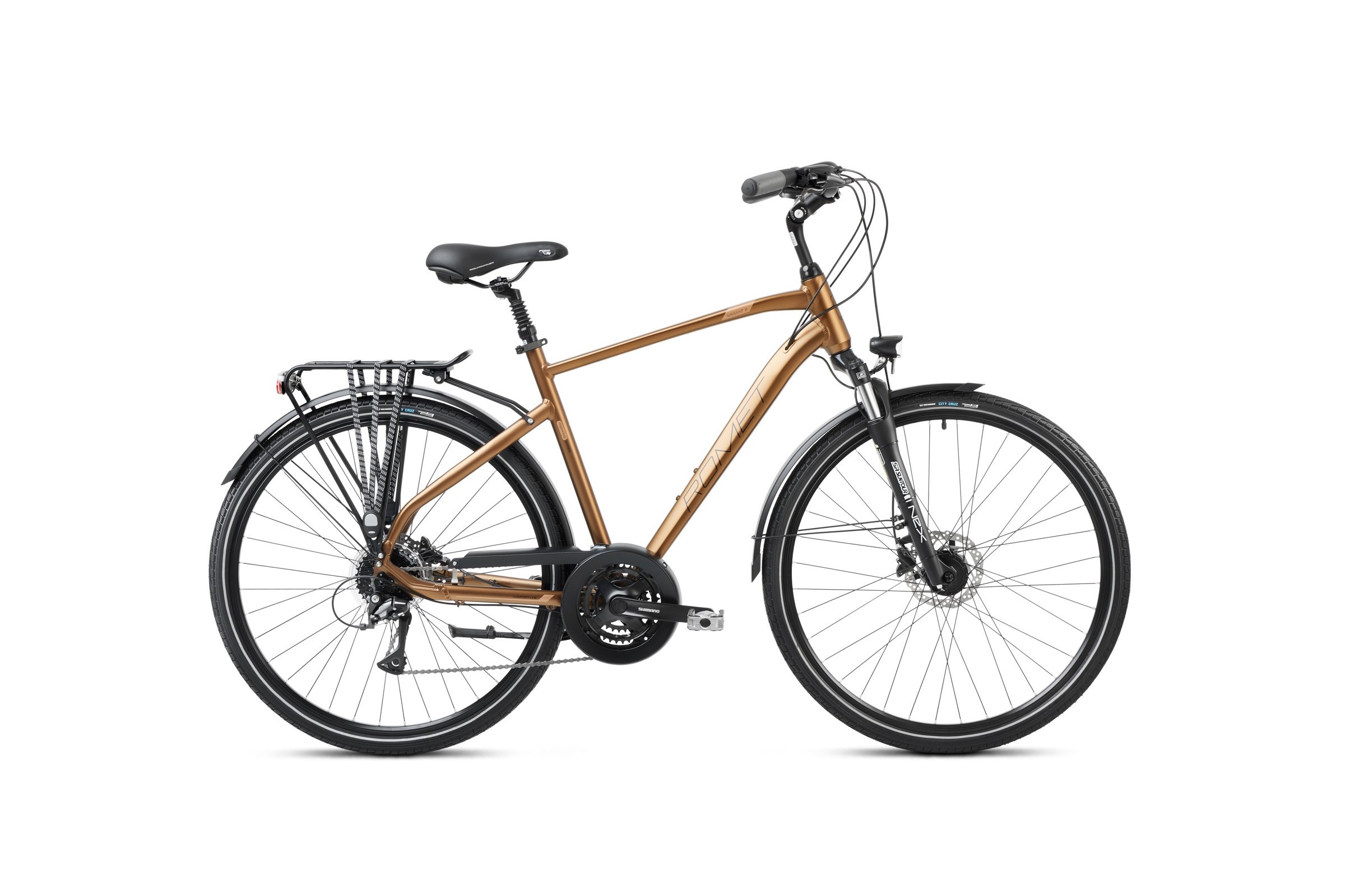 Romet Wagant 6 to bardzo uniwersalny i bardzo dobrze wyposażony model. Seryjna specyfkacja zawiera elementy, ułatwiające dalsze podróże oraz codzienną eksploatację. Osłona napędu wraz z błotnikami sprawią, że jesienna czy zimowa aura nie będą przeszkodą w jeździe, a solidny bagażnik pozwoli zabrać najpotrzebniejsze przedmioty ze sobą. O wygodę korzystania dba również regulowany wspornik kierownicy, dzięki któremu w prosty sposób można ustawić odpowiednią pozycję. Przedni amortyzator jest już dawno standardem w tej klasie roweru, dlatego za tłumienie nierówności na trasie dba sprawdzony Suntour o ugięciu 63 mm. Wagant oferuje 24 przełożenia, których obsługa jest prosta za sprawą napędu Shimano w układzie 3×8. Model wyposażony został w hamulce tarczowe, które działają niezależnie od pogody, i które sprawdzą się szczególnie kiedy będziemy jechać z bagażem. Wagant 6 jest dostępny w dwóch wariantach kolorystycznych i trzech rozmiarach ramy.