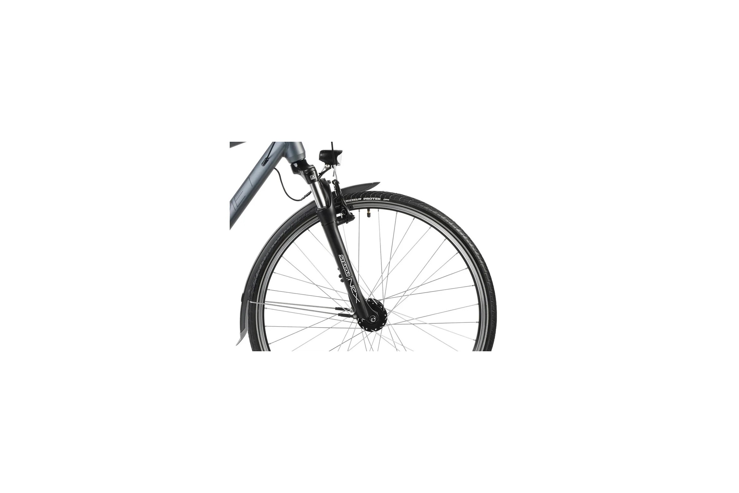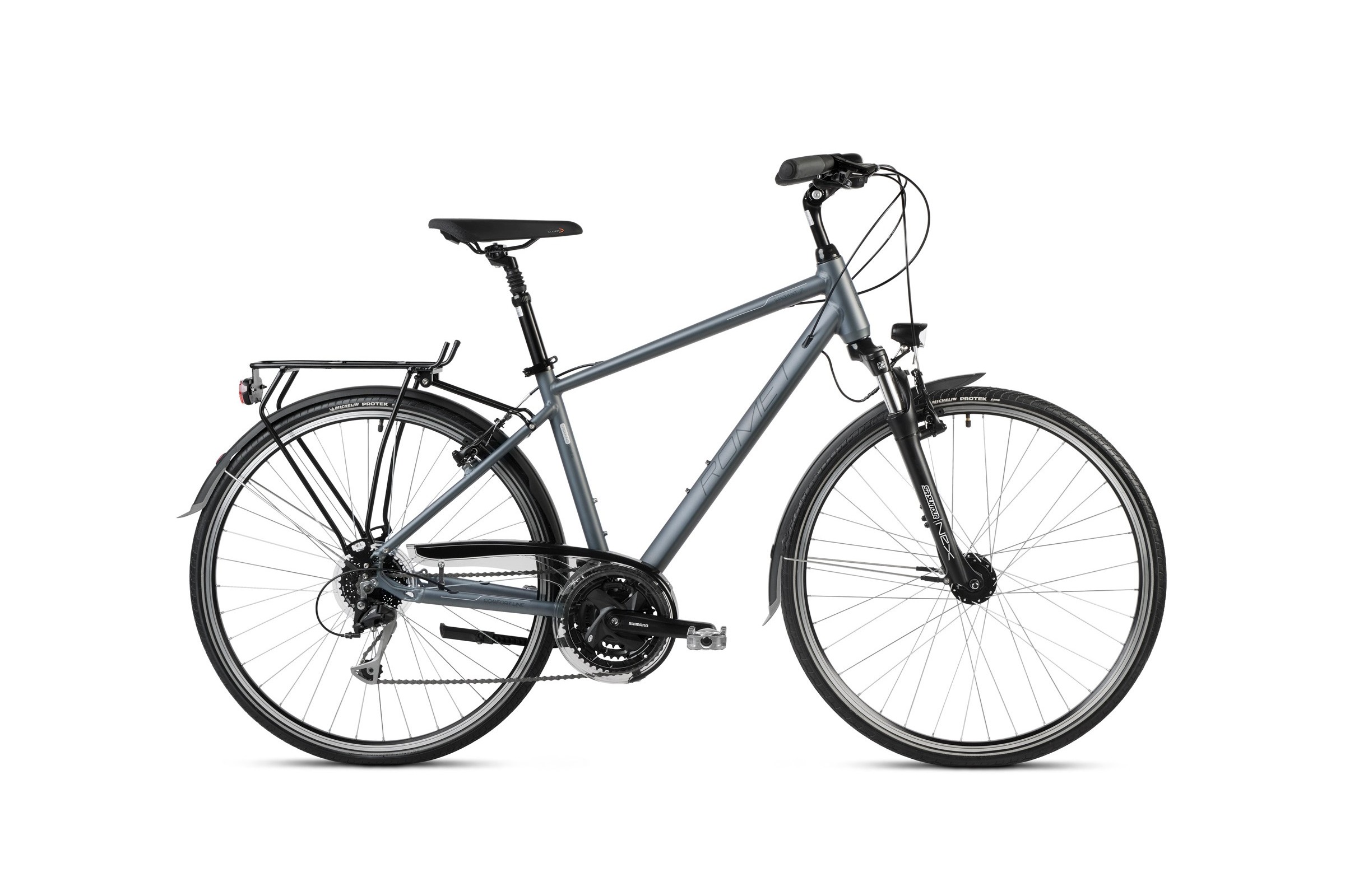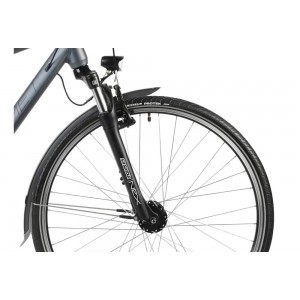 Rowery trekkingowe cieszą się dużą popularnością głównie za sprawą możliwości ich wykorzystania. Sprawdzają się zarówno na długich jak i krótkich odcinkach. Tak też jest z naszą Wagant. To niezawodny i komfortowy sprzęt m.in. za sprawą amortyzatora SR Suntour NEX-P skutecznie łagodzącego najdrobniejsze nierówności terenu. Rower, który można zabrać nawet na wielodniową wyprawę musi być wytrzymały i bezobsługowy. Połączenie grup osprzętu Shimano Alivio i Altus za pośrednictwem napędu w układzie 3×9 gwarantuje trwałość oraz wysoką kulturę działania. Waganta wyposażyliśmy w hamulce Shimano V-brake o dużej skuteczności hamowania. Model w swojej specyfikacji ma również błotniki i osłonę napędu chroniące przed deszczem i błotem oraz oświetlenie przednie i tylne zapewniające bezpieczeństwo. Wagant posiada regulowany wspornik kierownicy pozwalający w łatwy sposób ustawić komfortową pozycję.