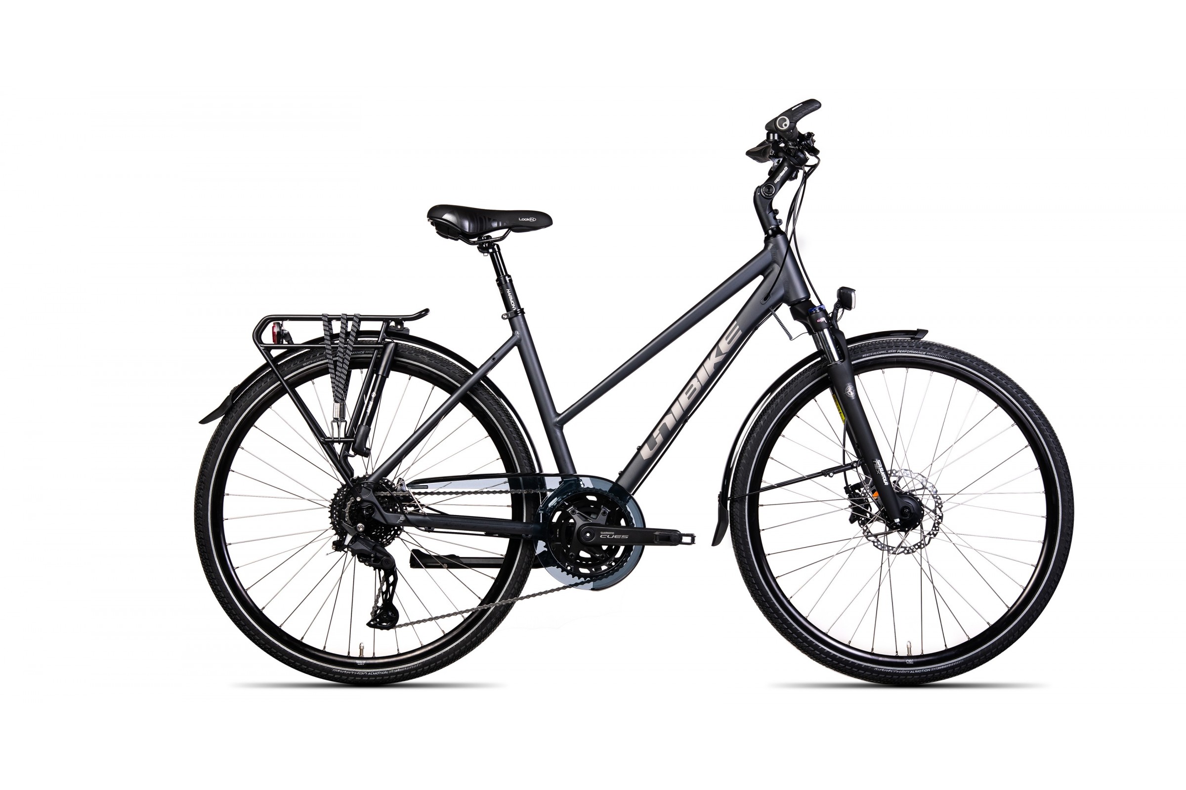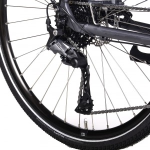 Solidne koła JHT z mocnymi obręczami i czarnymi piastami Shimano (przednia z prądnicą) gwarantują wytrzymałość oraz niezawodność przez wiele sezonów. Opony SCHWALBE MARATHON ALMOTION 28x1.60 z paskiem odblaskowym zapewniają niskie opory toczenia, świetną przyczepność na różnych nawierzchniach oraz zwiększone bezpieczeństwo po zmroku.