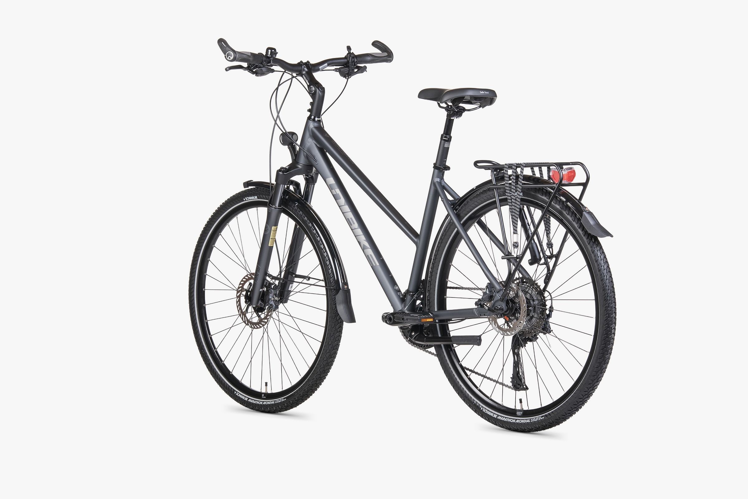 Regulowany mostek ERGOTEC OCTOPUS AHEAD 50 oraz chwyty z rogami ERGON GP3-L tworzą ergonomiczny kokpit, który skutecznie eliminuje drętwienie dłoni. O Twój kręgosłup na wybojach dba amortyzowana sztyca SATORI HARMONY-LT2 w doskonałym połączeniu z żelowym siodłem LOOKIN MODERATE. Bezpieczeństwo po zmroku gwarantuje lampa BUSCH+MULLER LUMOTEC IQ-XS (aż 80 LUX!) ze światłem do jazdy dziennej i podtrzymaniem postojowym. Wyprawową całość dopełnia supermocny bagażnik STANDWELL pod sakwy, błotniki i pompka, solidna podpórka oraz przyczepne aluminiowe pedały VP.