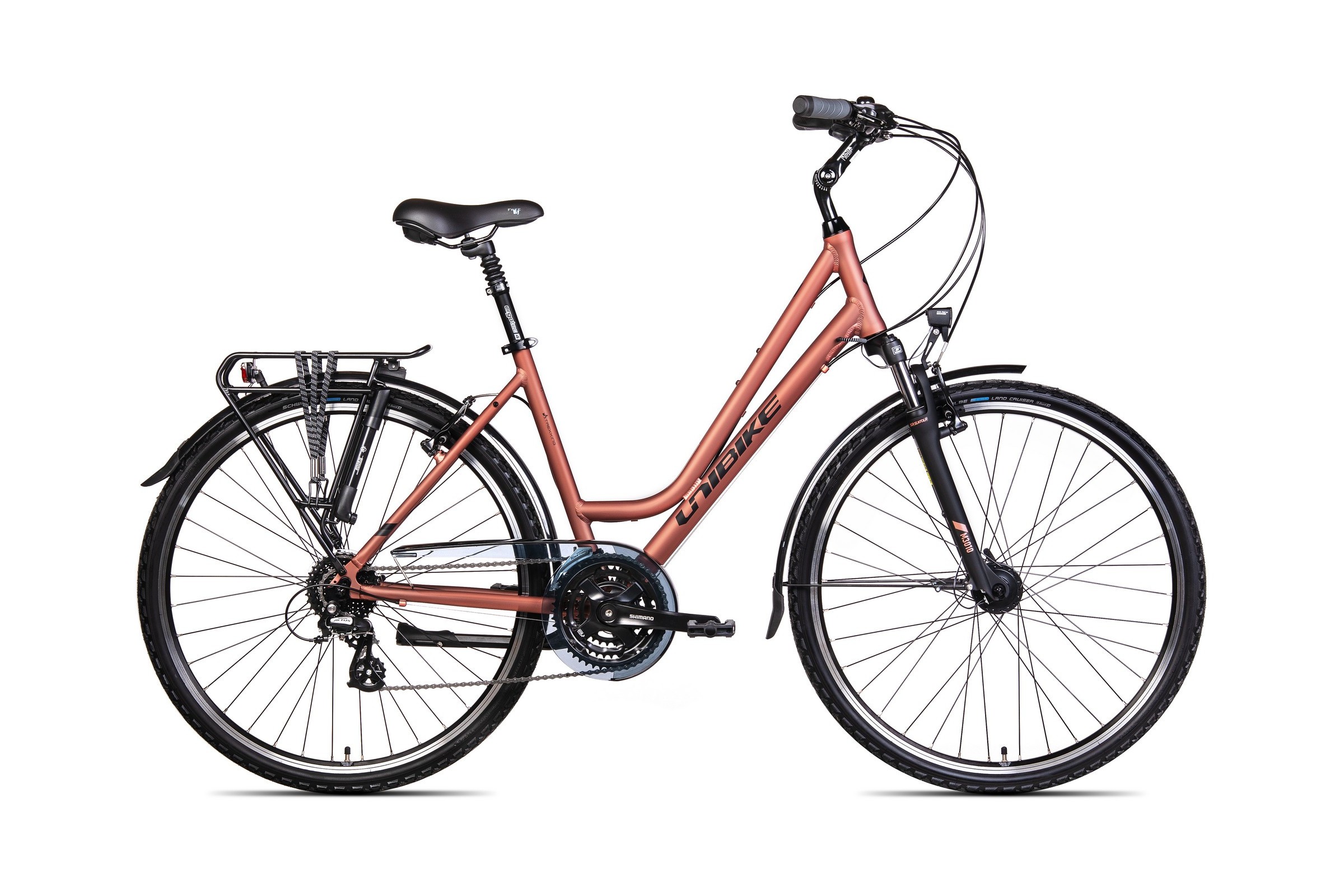 Rower toczy się gładko na dużych, 28-calowych kołach ze wzmacnianymi, frezowanymi obręczami JHT. Ubrano je w markowe opony Schwalbe Land Cruiser (28x1.60), które gwarantują niskie opory toczenia na asfalcie i świetną przyczepność na szutrze. Z przodu znajduje się bezoporowa piasta Shimano Nexus C3000-3N z wbudowaną prądnicą, a z tyłu solidna piasta Shimano TY500.