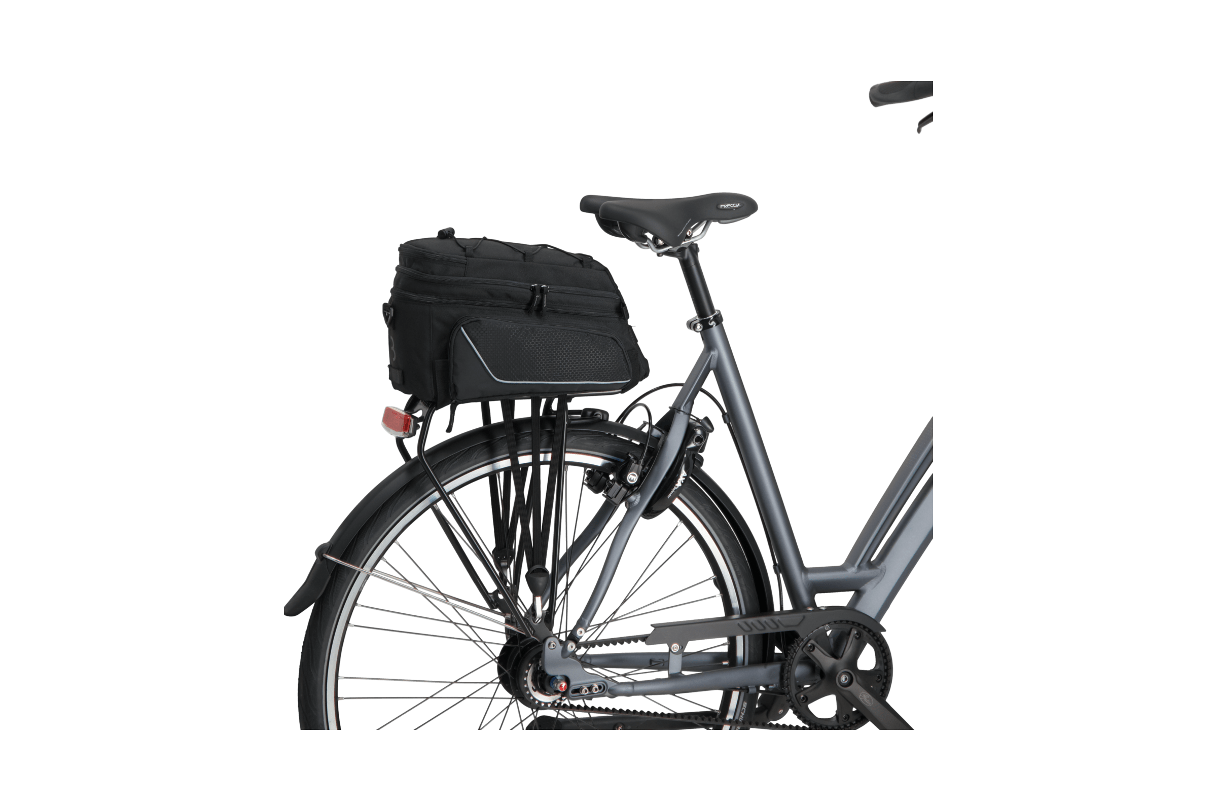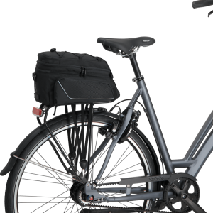 Torba mocowana jest do roweru za pomocą pasków na rzepy, co ułatwia mocowanie i odłączanie. Paski na rzepy składają się z dwóch stron, jednej z haczykami, a drugiej z pętelkami, które się ze sobą łączą. Oznacza to, że nie potrzebujesz żadnych narzędzi, aby przymocować tę torbę do bagażnika
