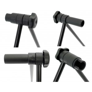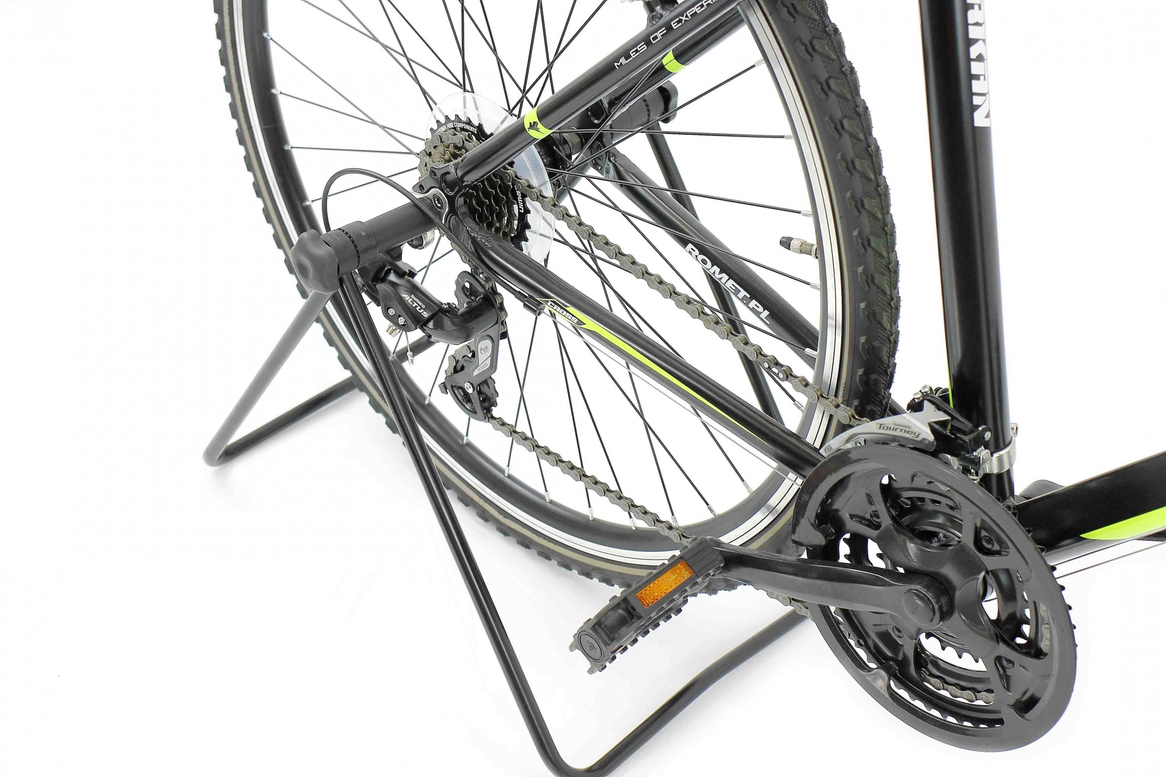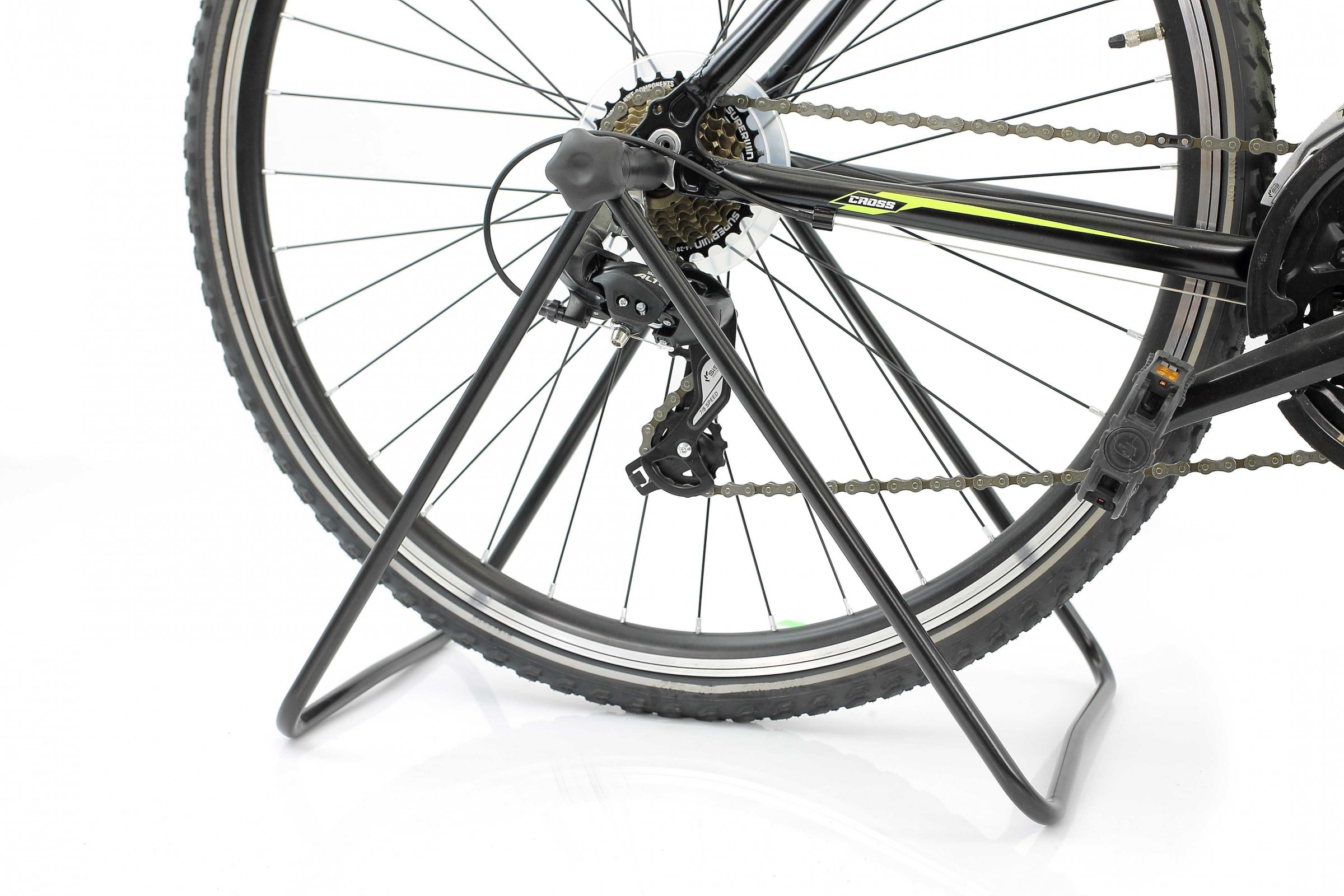 - Kształt stojaka nie przeszkadza w swobodnym obrocie pedałami dzięki czemu można z niego korzystać podczas czyszczenia oraz smarowania napędu a także regulacji napędu.